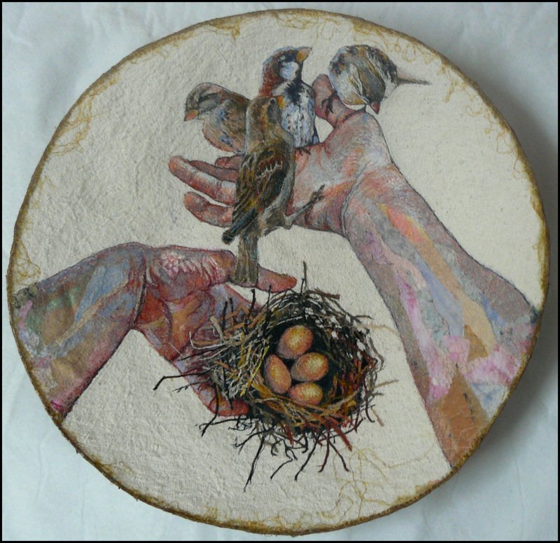 KathrynHarmerFox A Bowlful of Birds - Made specifically for an exhibition in the cellar of a wine farm - all the works had to be round in order to be displayed on the wine barrels.