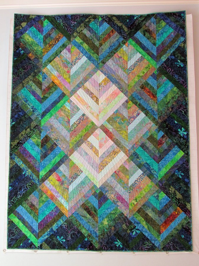 drickenbach Sunlight Penetrates the Rain Forest - Blue and green batiks in a color value study. Quilted with Superior Threads Glitter to give the quilting sparkle.