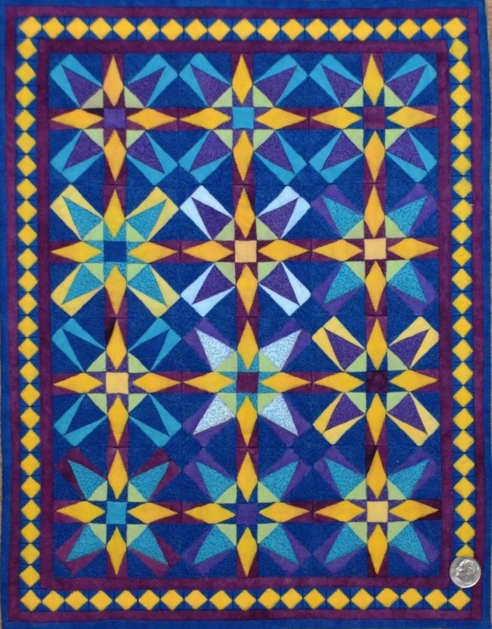 CMOELLERS Twinkle, Twinkle, Little Star - This little quilt was adapted from a 12" block pattern I saw on the Quilters Cache web site. I down sized the block to a 3" block. Added border sashing with little diamonds. Loved working with Ricky's hand dyes for this mini. It was paper pieced using June Tailor Perfect Piecing transparent foundation sheets. Just left the non-woven product in the quilt and it was a great stabilizer for keeping the fabric from distorting.