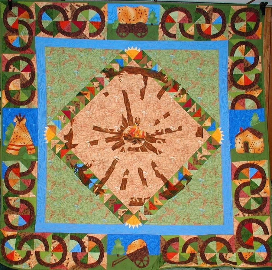 judylyon Westward Ho - “Blazing trails across the years, Blessed honored Pioneers.” Westward Ho honors the brave men and women who forged across our continent. It contains Native Americans, Pony Express, Trappers, Covered Wagons, Music and Dance around the campfire, Landmarks, Bison and Pronghorns, even my blind Great-Grandfather holding to the back of the wagon -- all bound together within the spokes of a Wagon Wheel.