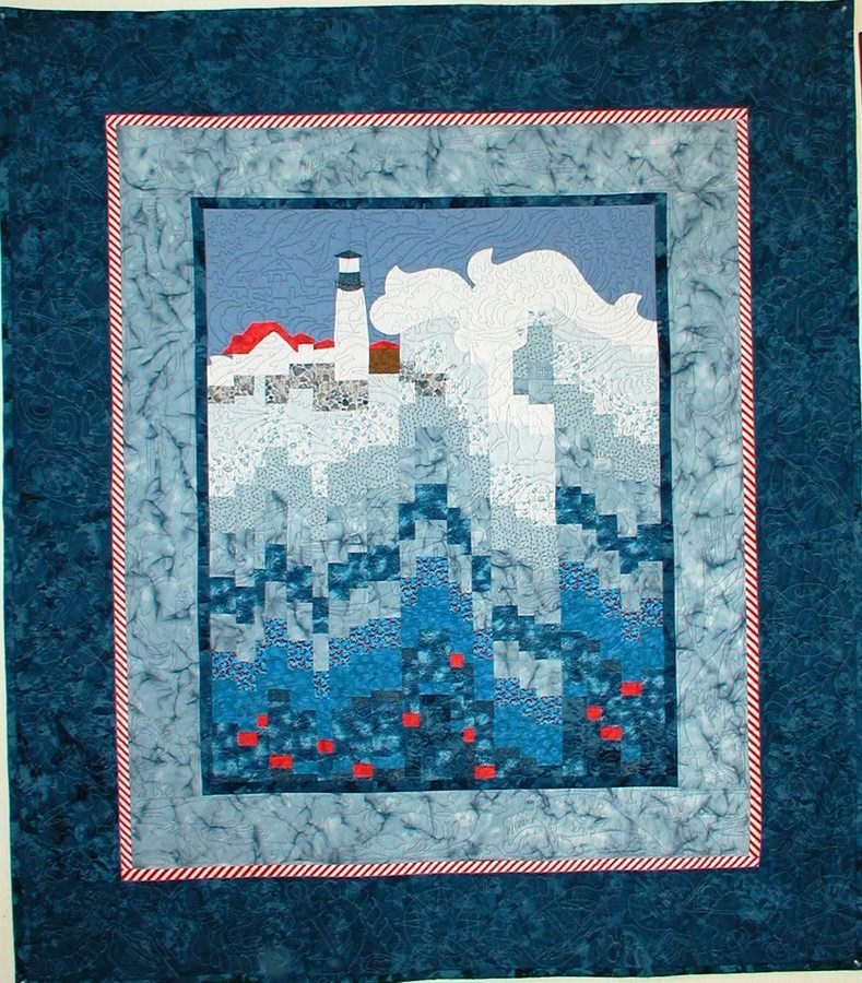 | Design Source - Description | Brrr! Frothy seas and driving snow pummel Portland Light in this impressionistic bargello quilt. Original quilting Meadowlyon pantograph patterns, “Nor-Easter,” Salty Seas,” and “Whale of a Tail,” add interest and detail. |