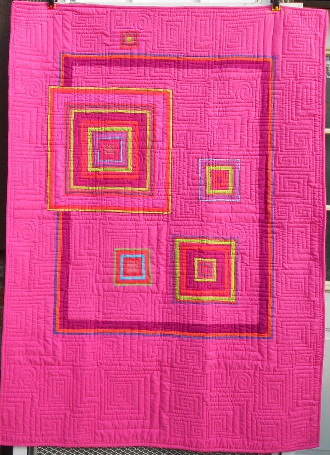 judylyon Pink Squares - “Everything today is thoroughly modern!” So I couldn’t resist trying it. I wanted to piece some squares from striped fabric. I used Kaffe Fassett stripe and a plain pink background. Luckily I found the strips for the large box in my “stash.” I quilted this piece with MeadowLyon’s “Modern Squares” pantograph.