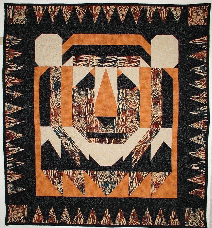 judylyon Jungle Tiger - My son loves orange, hence a tiger for graduation. From Southeast Asia it’s appropriately Batik with jungle animals and plants stitched throughout! Original quilt and “Jungle,” stitching pattern designed by Judy Lyon, MeadowLyon Designs,