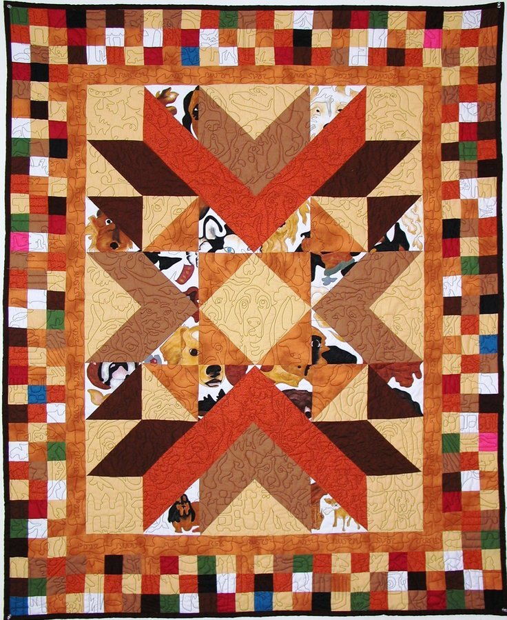 judylyon Dog Patch - This bright, elongated, big patch was created to showcase the faces from my “Dawgs” stitching pattern. While working on it I decided it needed a special canine border and created the pattern “In The Doghouse.” After it was quilted I painted the dog faces, where they fell on white triangles, with Shiva Paintstiks.