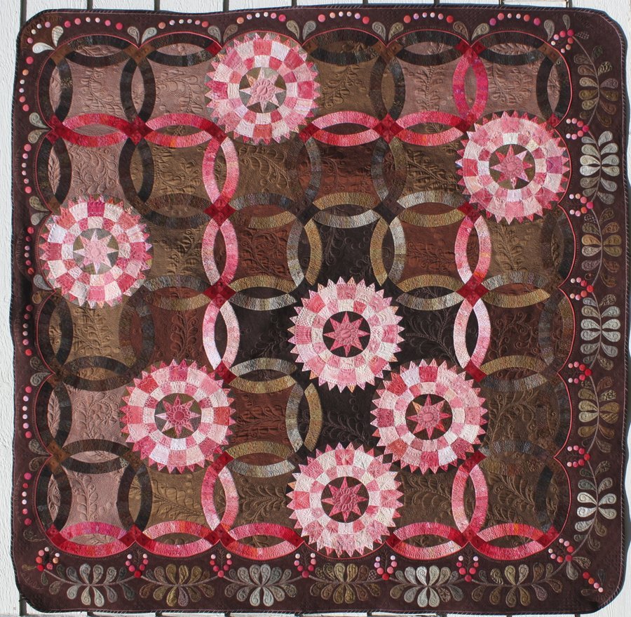 annlp Georgetown Wedding - A Double Wedding Ring Quilt with Georgetown Circles inset. Georgetown Circles designed on Electric Quilt after an antique quilt. Original appliqué borders. The background is a silk/cotton blend with shading from dark in the center to light at the edges, while the rings are light in the center and dark at the edges.