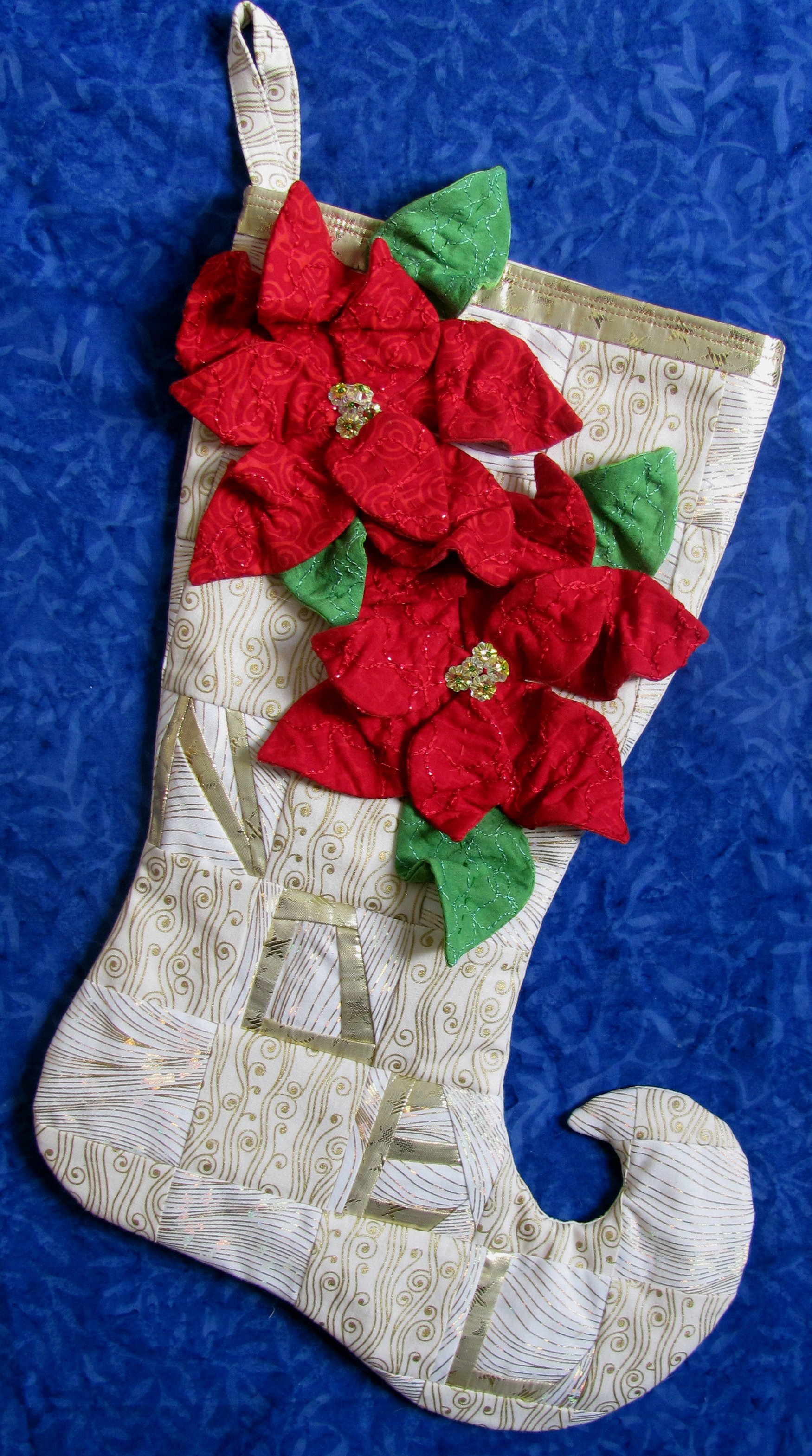 peckspieces Christmas stocking I designed and entered into Nancy Zieman's Stocking Challenge. Thread work was done on the fabric for the flowers and leaves. Very hard to see in this picture. The letters for Noel are Lame.