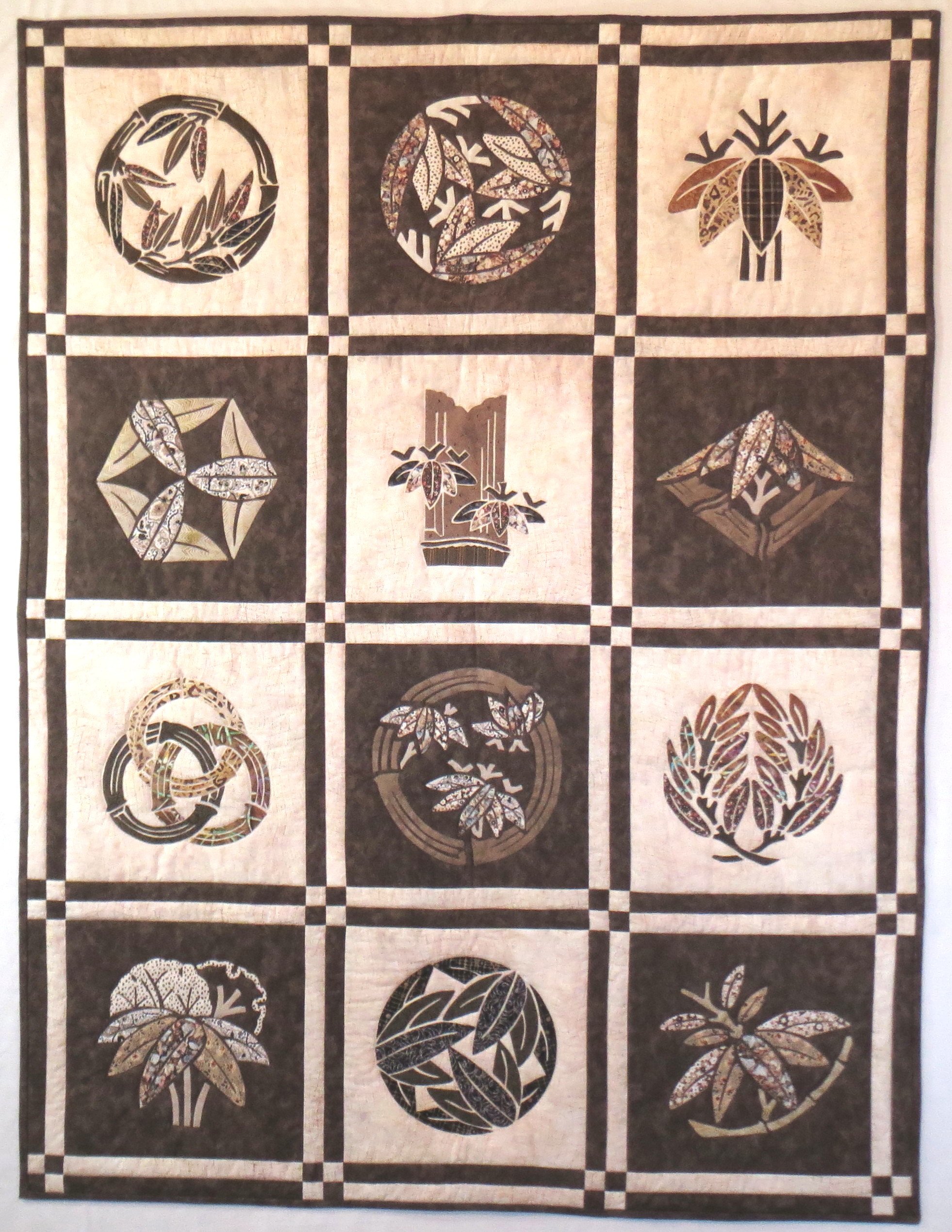 shirley803 The quilt has twelve blocks, each based on a Japanese family crest that in turn is inspired by bamboo. More than thirty years ago while travelling in Japan I purchased a book "The Elements of Japanese Design" by John W. Dower, published by John Weatherhill Inc. in 1971. I have been thinking about making a quilt from some of the designs for many years. I have been inspired by the work of Kitty and Sylvia Pippen and also Kamiko Sudo where some of the crests have been used, and used a few in an earlier quilt. This quilt is my first with original designs adapted from the Dower book. Applique is fused and edge stitched.