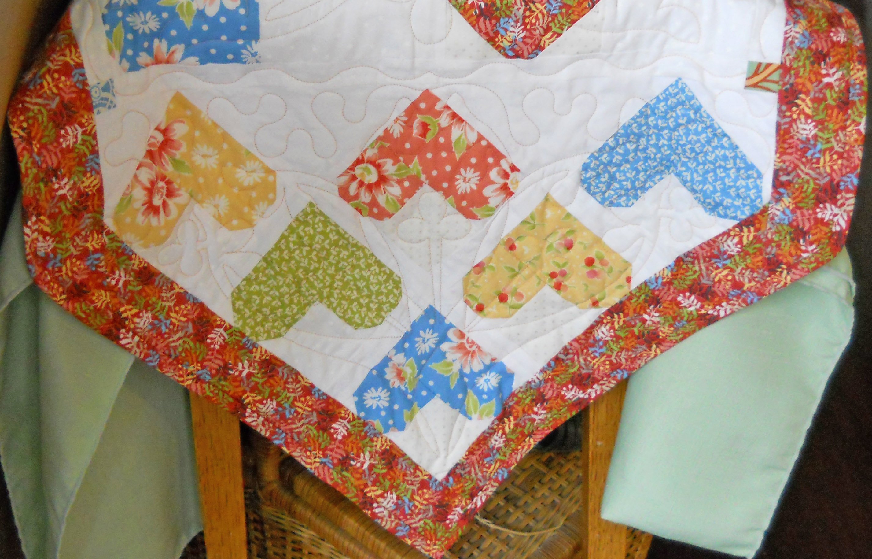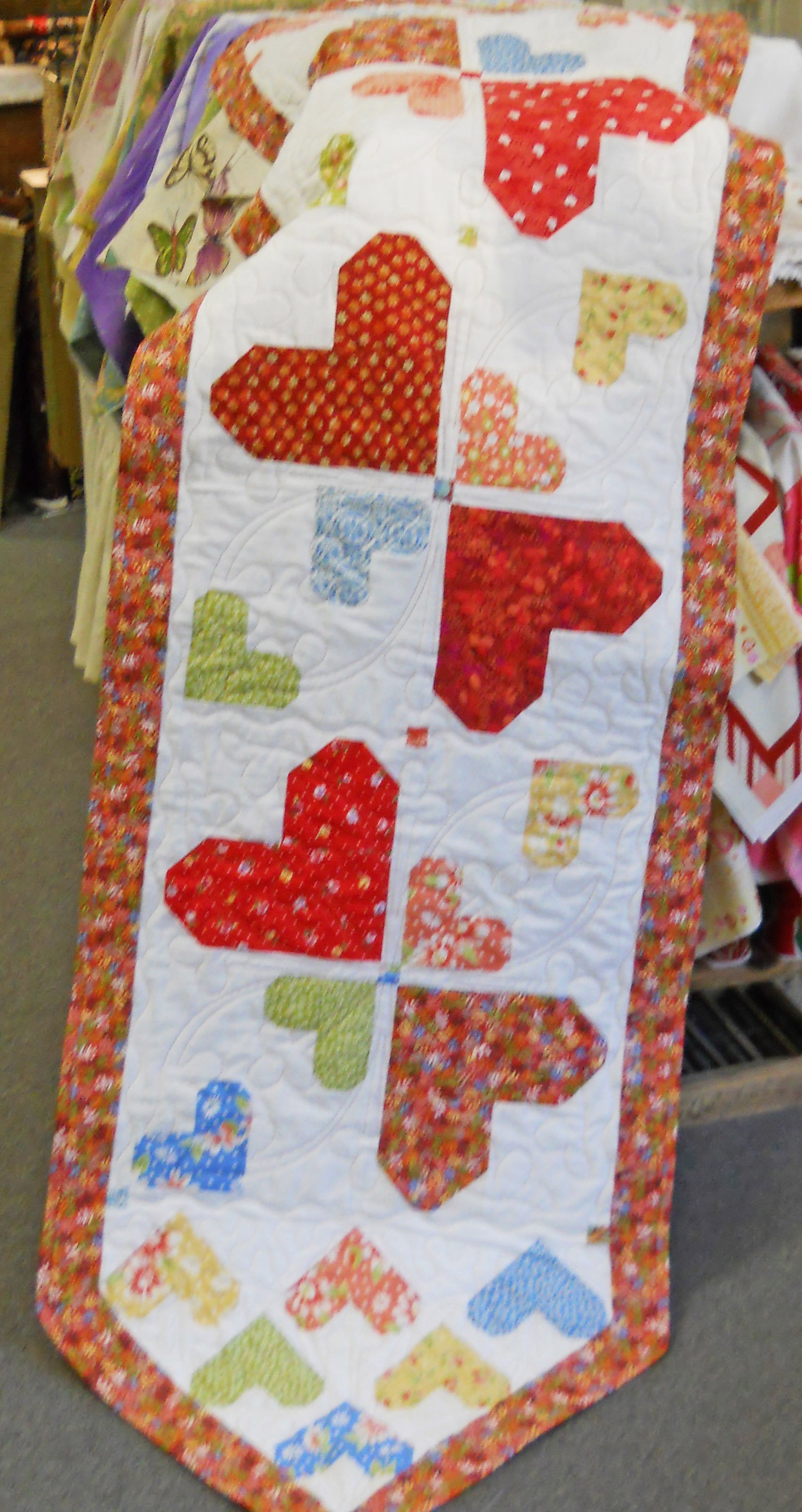 Ladylike Love heart quilts! Random Hearts is my original pieced design with large and small hearts set in a chain design for easy piecing. I chose bold reds of many colors to speak as the large hearts and to sit in the background, I chose softer, medium value hearts of a smaller size - gives the quilt just the right flair! One of my most popular classes and patterns - pattern includes a table runner version as well as quilt!
