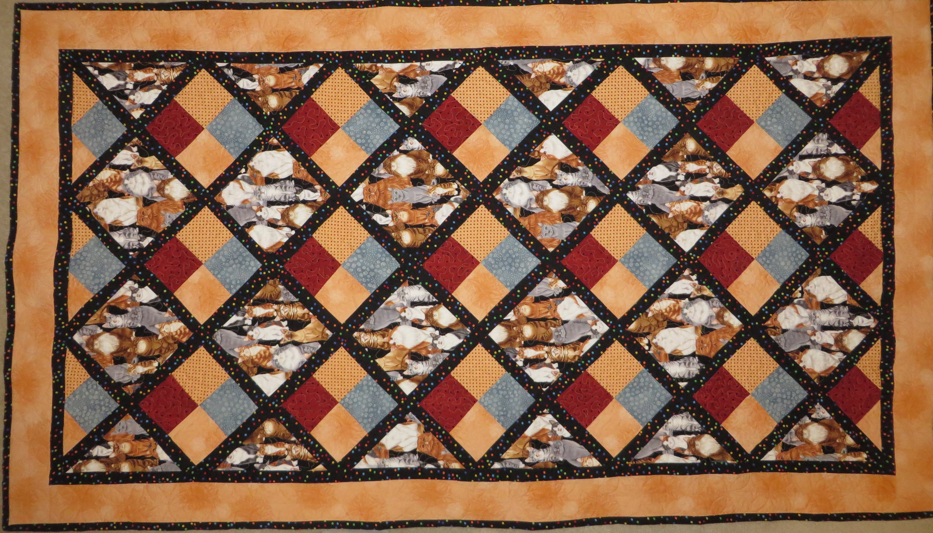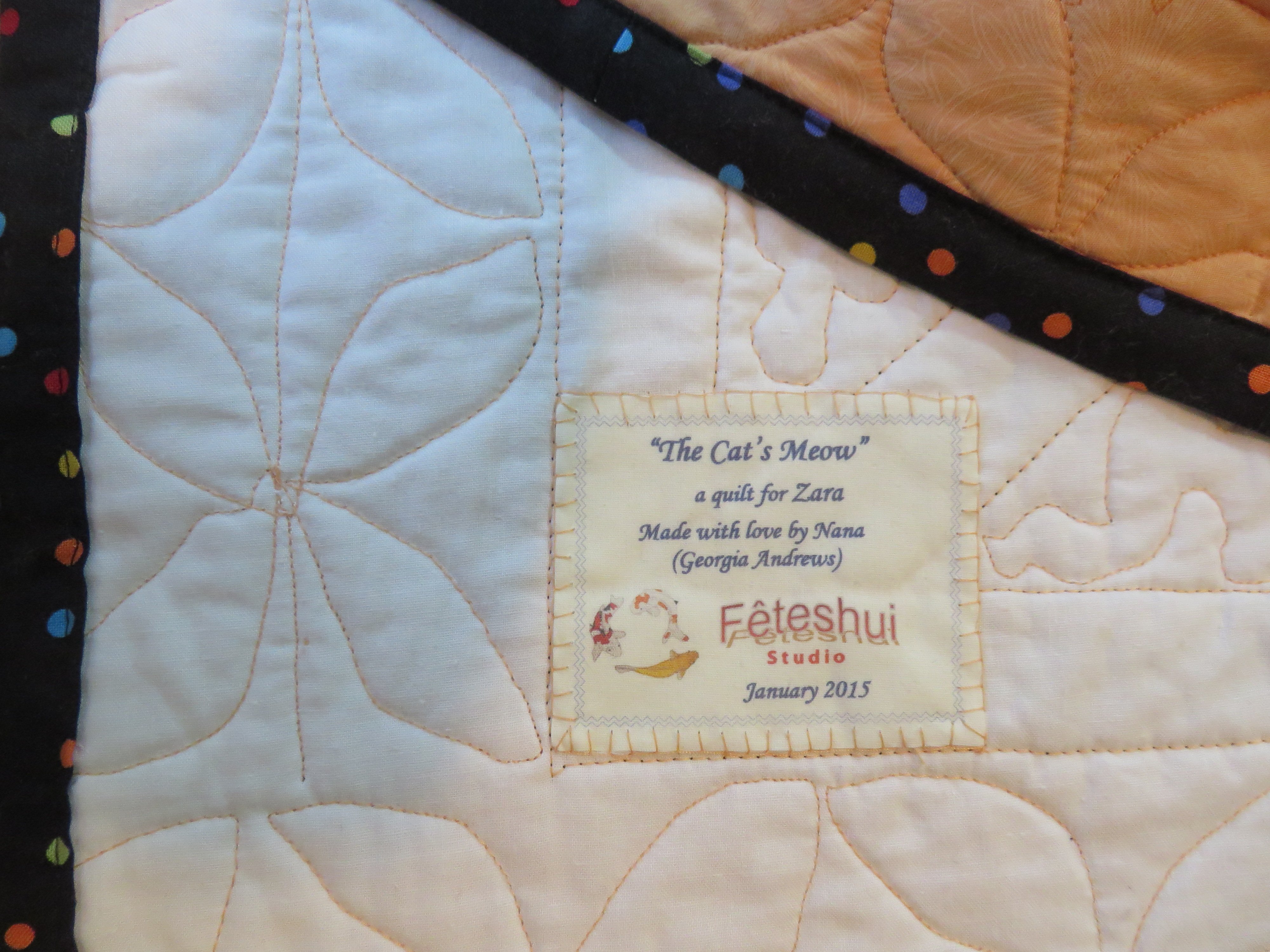PacificGeorgygirl Deviating from my Art Quilter roots, this is the first traditional, pieced quilt for me. When my granddaughter requested a kitty cat quilt for her first "big girl" bed, I found a simple pattern (which I enlarged and made minor changes to), located the cat fabric and all the coordinating fabrics (three were from my stash) and a lightly used white bed sheet was used for the backing. I really enjoyed constructing this quilt, and sharpened some skills in the process! Georgia Andrews - Fêteshui Studio