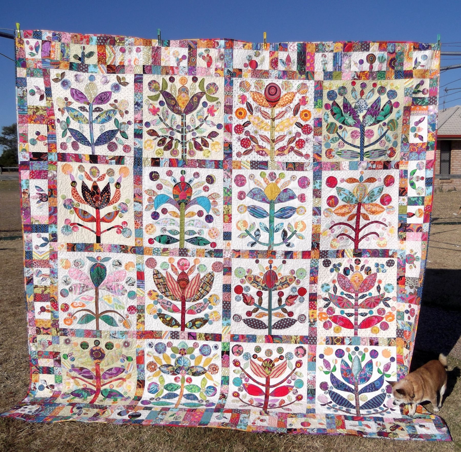 Chloe This quilt was made for my daughter's 21st birthday. It is hand-appliqued using predominantly Kaffe Fassett fabrics and varying low-value spotted backgrounds.