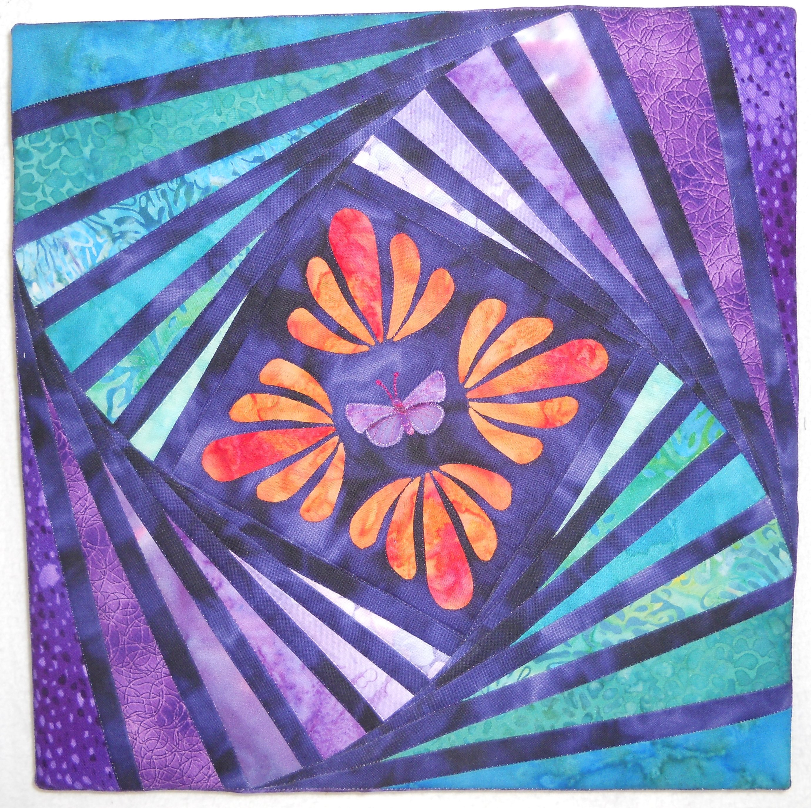 soleraquilter Wall quilt made to celebrate my granddaughter's graduation from Law School. It's foundation pieced from a pattern I found in the EQ6 block library, with hand applique in the center. It is stretched on artist canvas frame.