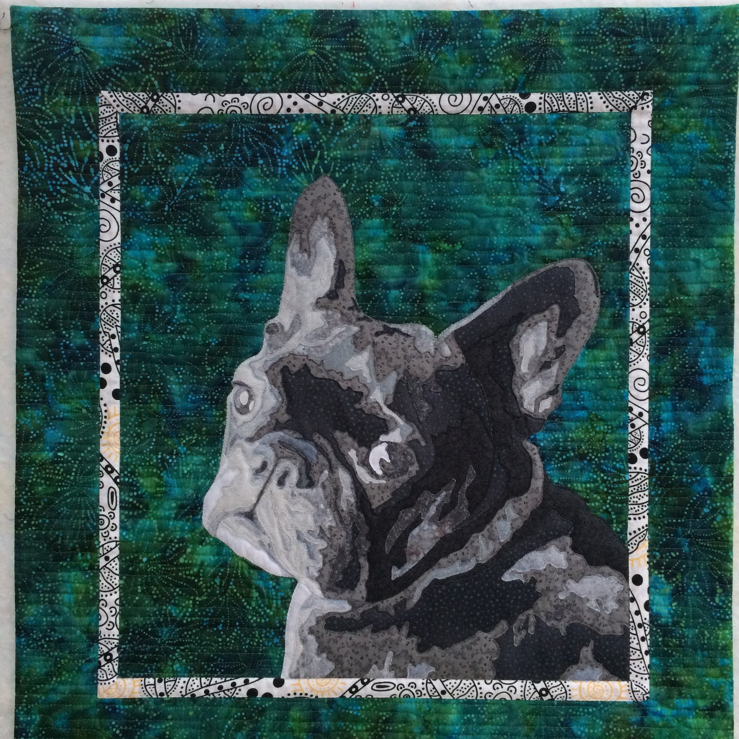 tobyfour This is a quilted portrait of Tinkerbelle, a french bulldog that frequents a local dog park. The portrait itself is made of 85 pieces of 9 different commercial quilting cottons. Each piece is stitched down in colour matched thread.
