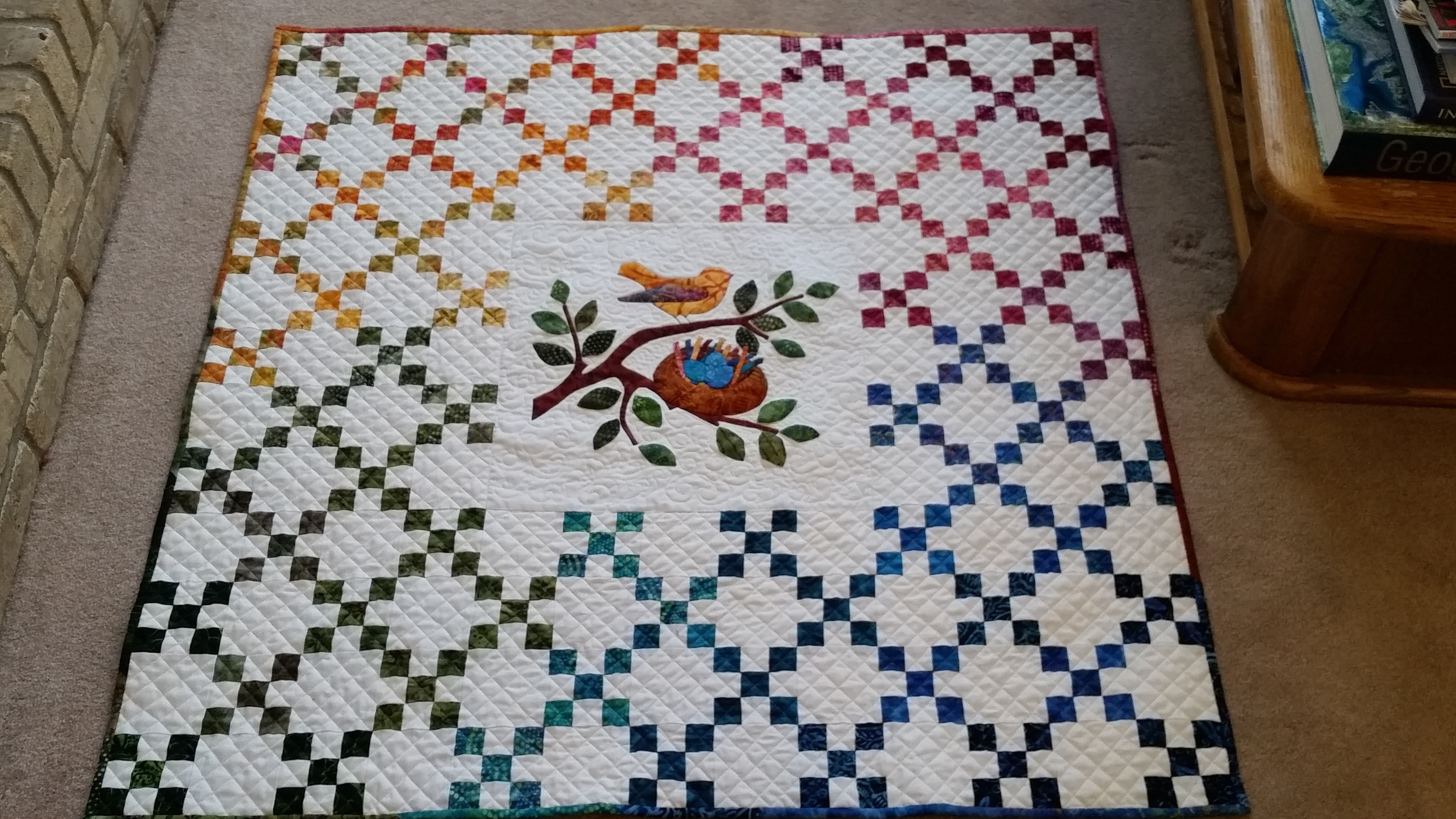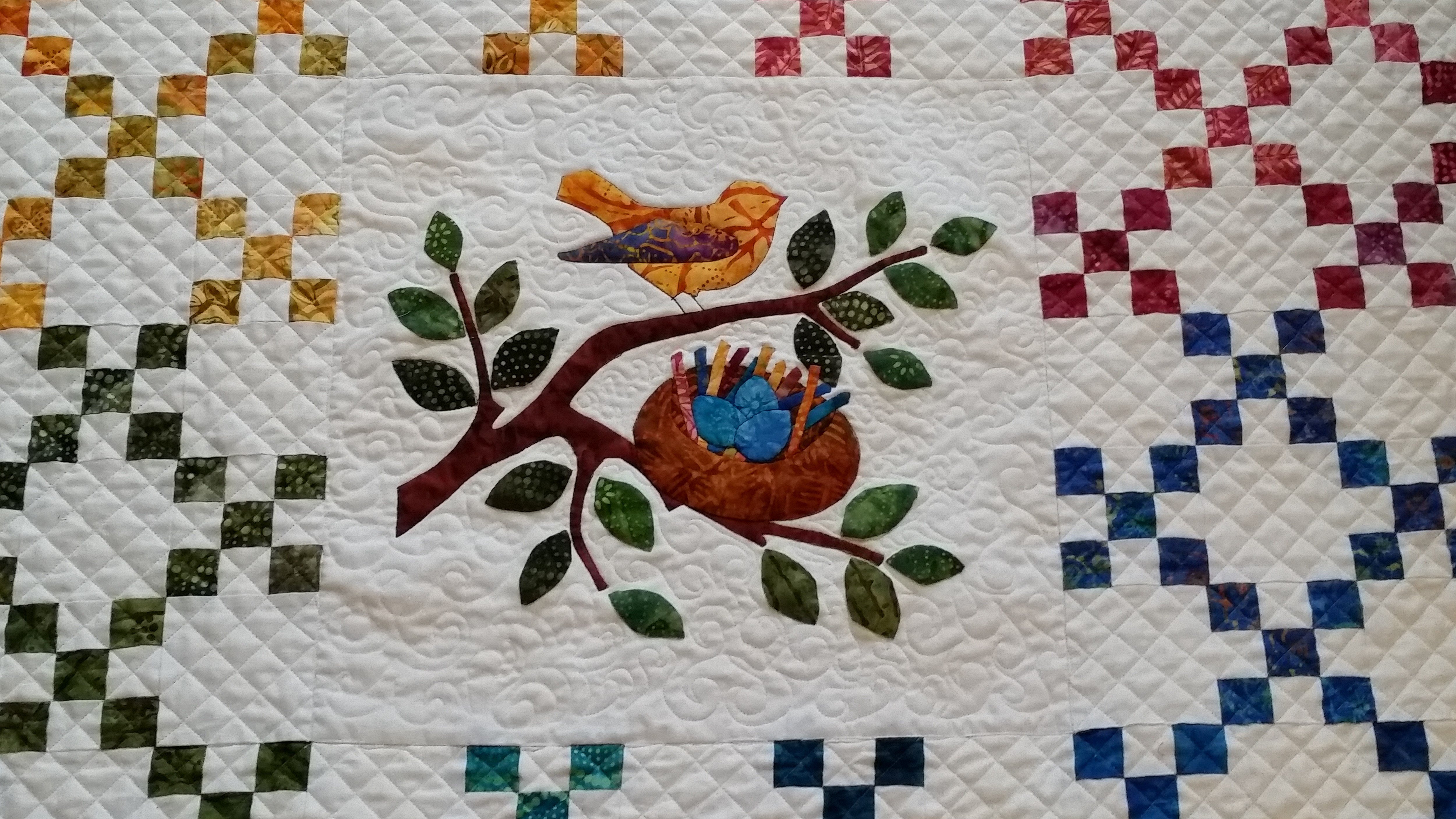 lWebQuilter Made the quilt for my daughter and her soon-to-be-born baby girl. The design is by Edyta Sitar of Laundry Basket Quilts. It is found in her children book of same title: Rainbow Nest. It is a combination of irish chain and raw edge applique. Instead, of the raw edge applique, I used needle-turned applique for the center medallion and freezer paper on top of the fabric while hand-sewing to hold and follow the shape of the elements. The background is white dots on white cotton fabric, and all the color fabric is batiks from the Rainbow line by Edyta Sitar. It took me twelve days, from start to finish, to complete this quilt, and a whole evening for cutting the fabric. The shape cut ruler was used for cutting the hundreds of little squares accurately and in very little time as it was possible to cut several layers of fabric at the same time. I also used chain sewing for the irish chain squares as demonstrated by Ricky Tims in one of his video on this site.
