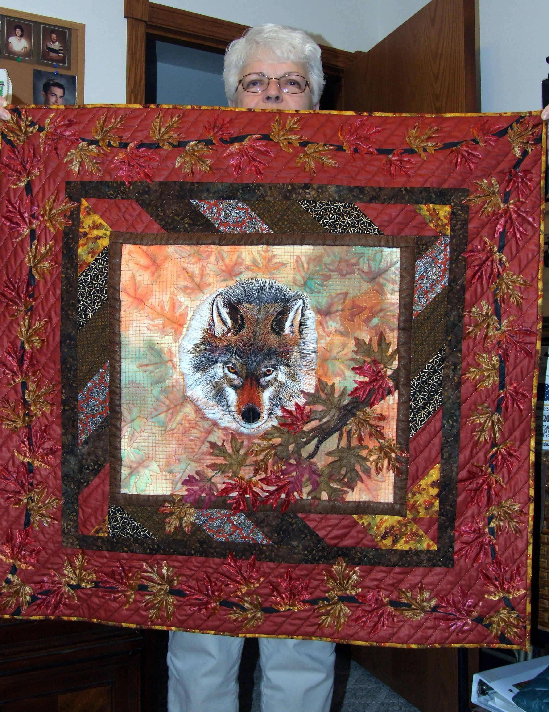 The center of this quilt is a hand embroidered thread painting of a wolf. It took 200 hours to make the center panel, then I painted the background and made trapunto leaves. The borders have 76 oak leaves sewn on them. I love the colors in this quilt and they go well with the room in which it hangs, my guest bathroom.