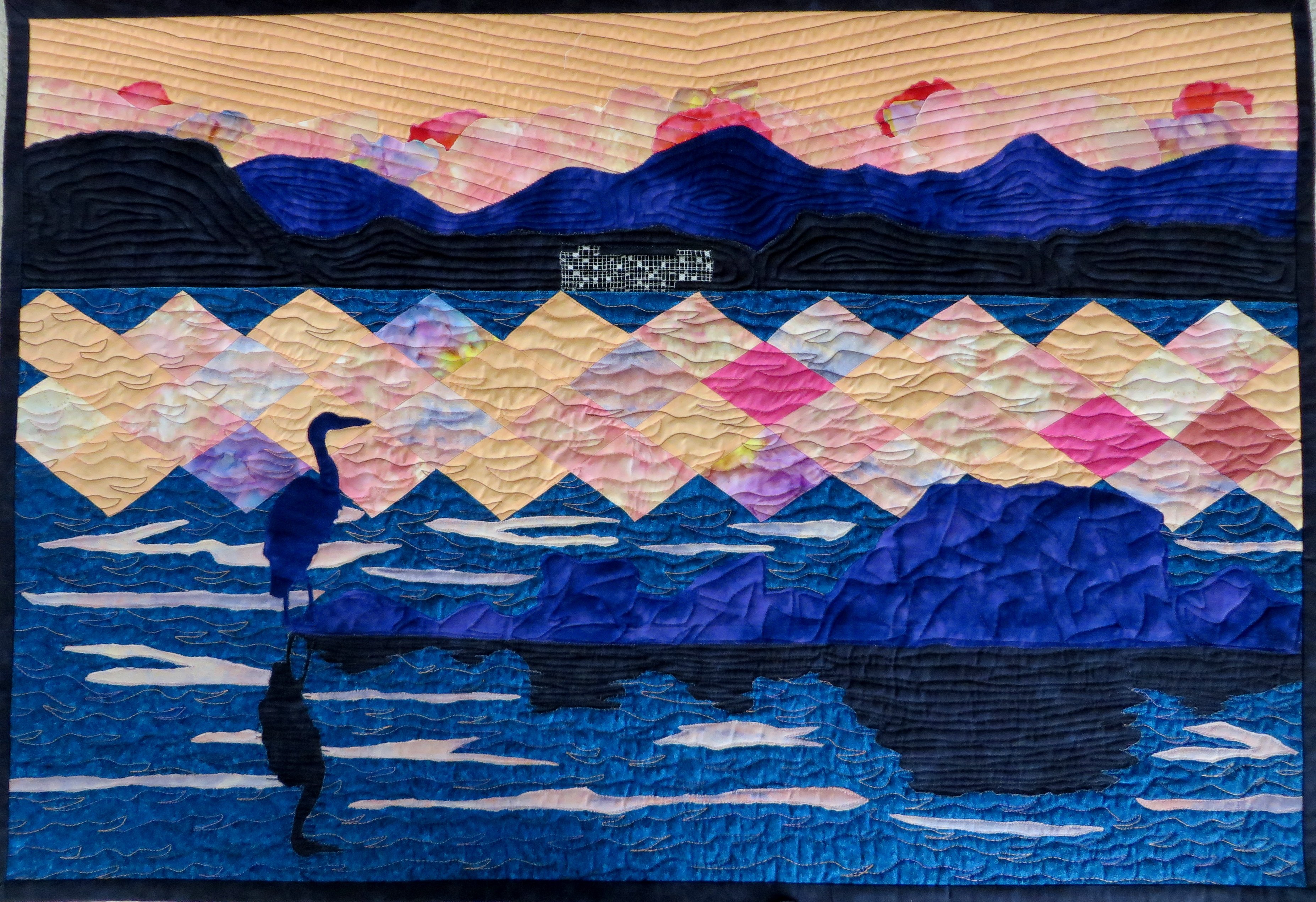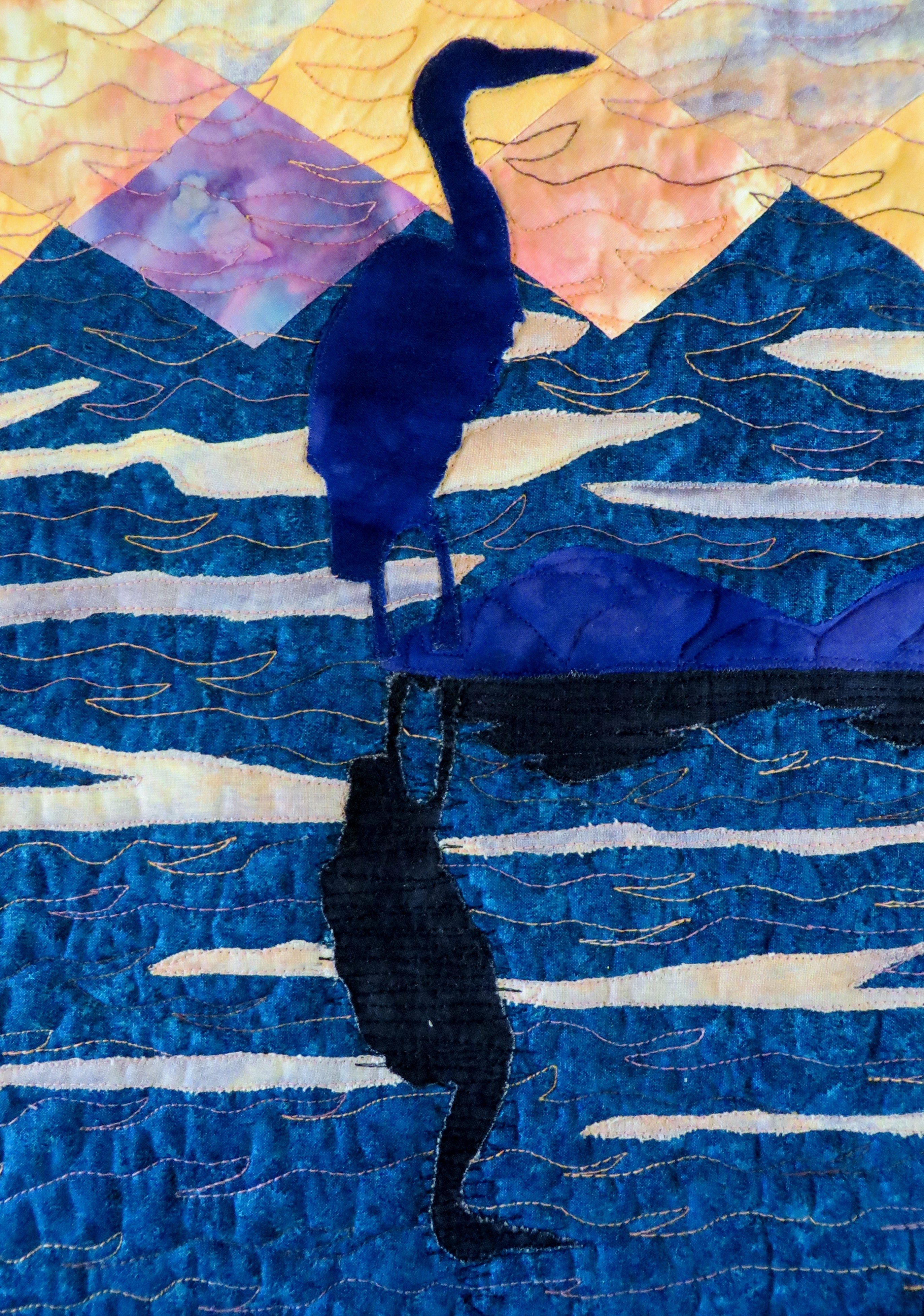 PacificGeorgygirl "Marmalade Sky" - Great Blue Heron at sunset - constructed with a combination of fused applique, traditional piecing and free motion stitching. Commercial cottons and recycled fabrics. Inspired by a photograph by Janis Morrison, Fresh Air Photography, by permission.