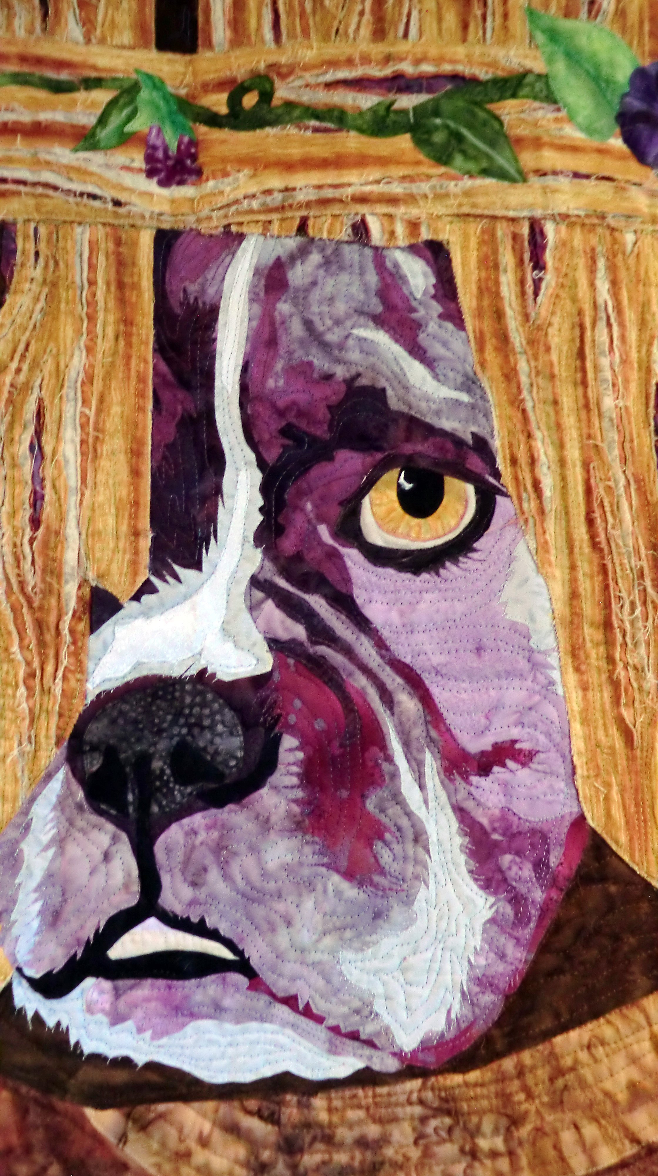 sherrie58 Inspired by the dogs next door that kept "an eye" on me for several summers. Dogs are created with raw edged fusible applique. Fence is created with several layers of fabric with a woodgrain fabric on top. Fabrics were stitched together in a woodgrain design then cut dow to different layers to achieve a rough look to the fence.Second place winner in Art Innovative in AQS Quilt show Chattanooga 2014.