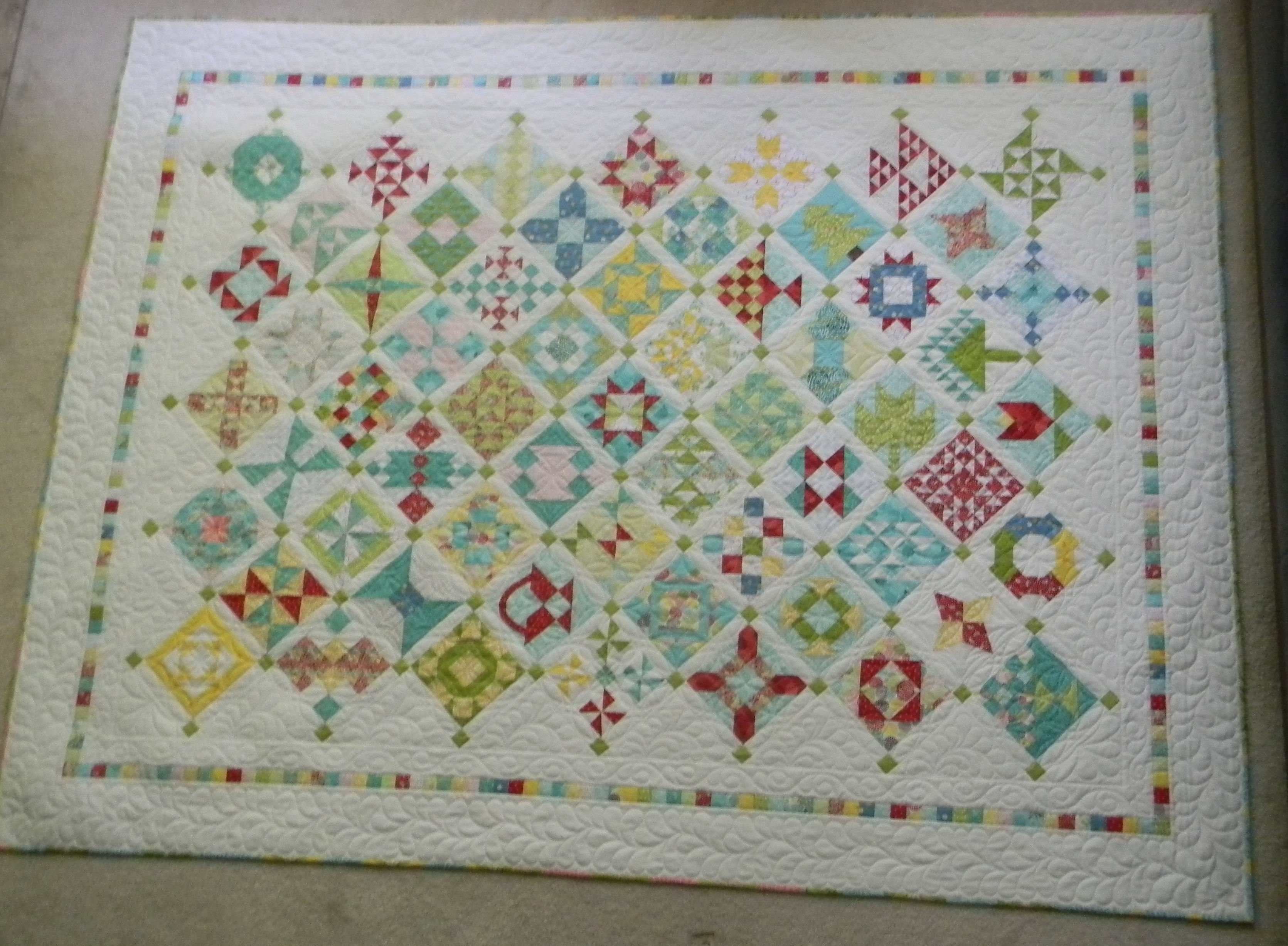 melanieg This is my take on the Farmers Wife quilt. Most of the blocks are true to the book but a few are added - including the crosse kayaks in honour of my other hobby. There is even a "humility" block! I noticed it when loading the quilt on the frame and decided to leave it.