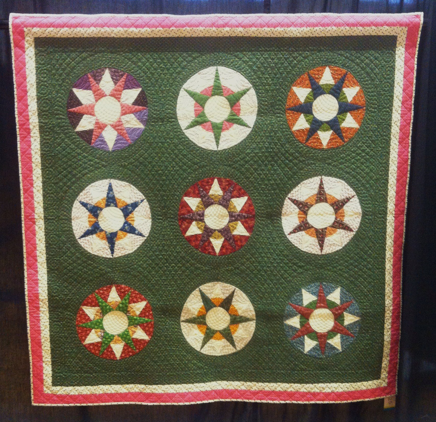 makesgeese I hand pieced the Mariners Compass blocks over several years on vacations in Vermont and on Cape Cod. The Muncy, PA Historical Society owns the orignal 1855 quilt. Two PA quilters, Neff and Youngman, drafted this pattern and reproduced the quilt. The orignal quilt has 36 compass blocks. Mine has 9...because "done" is fine by me!