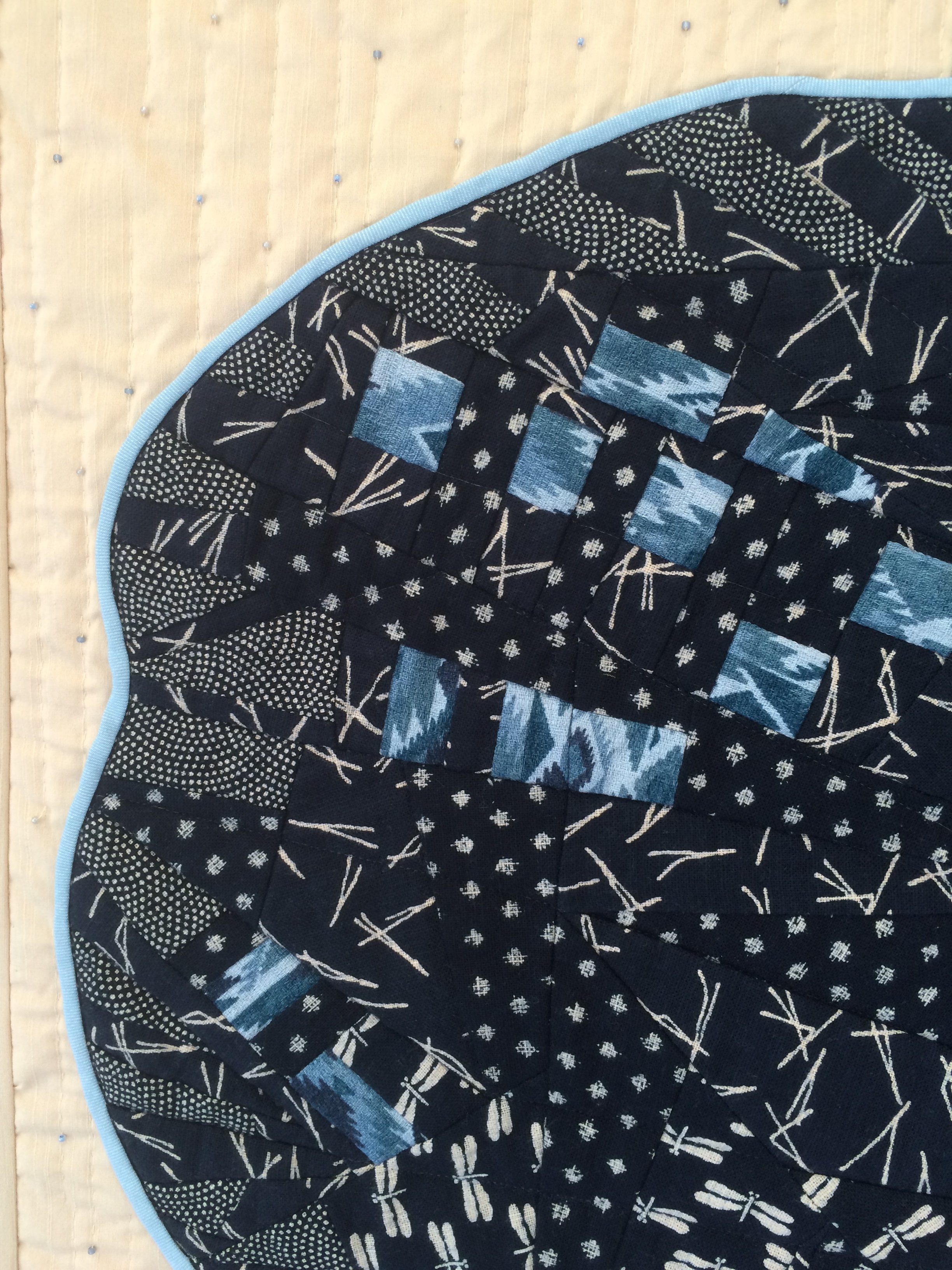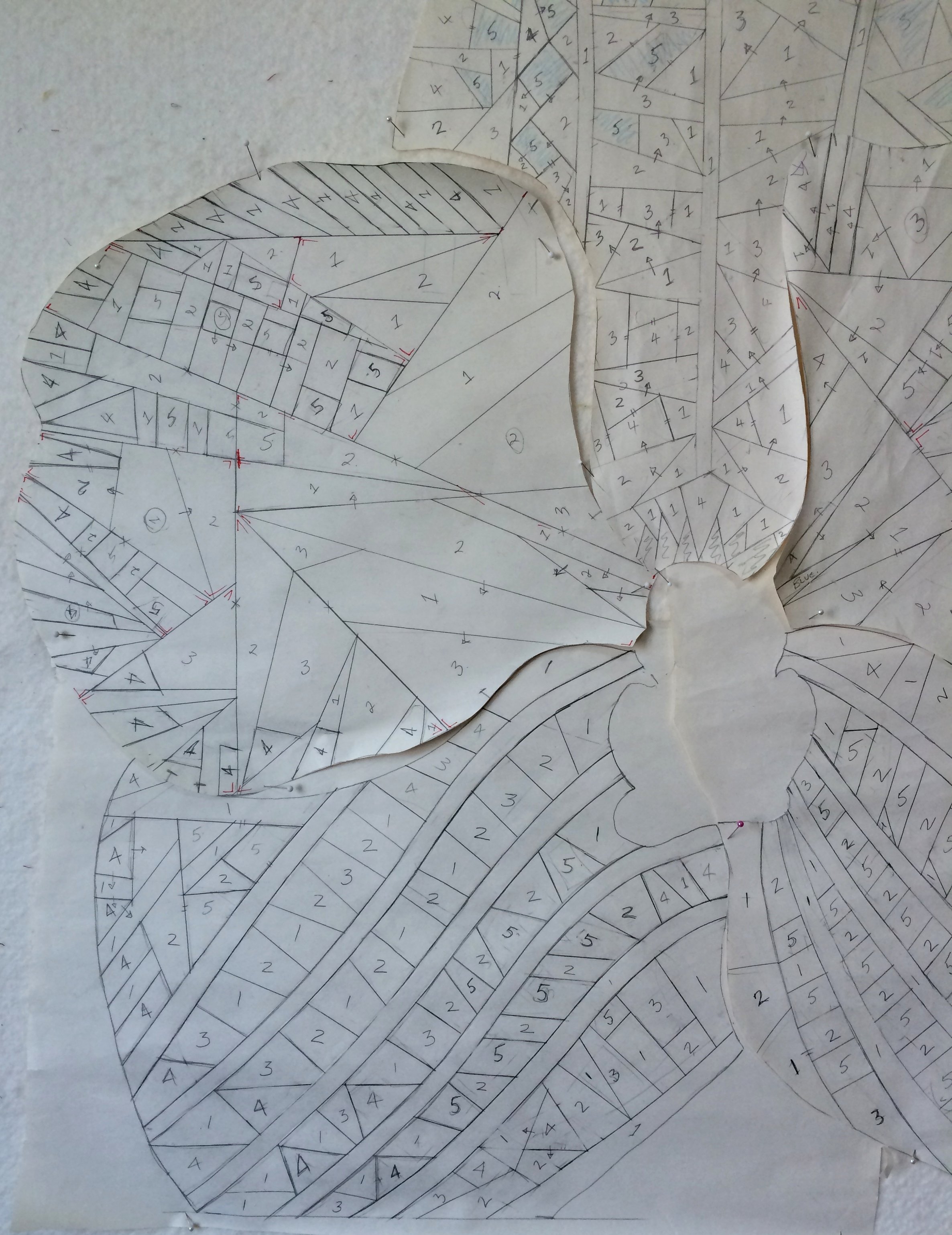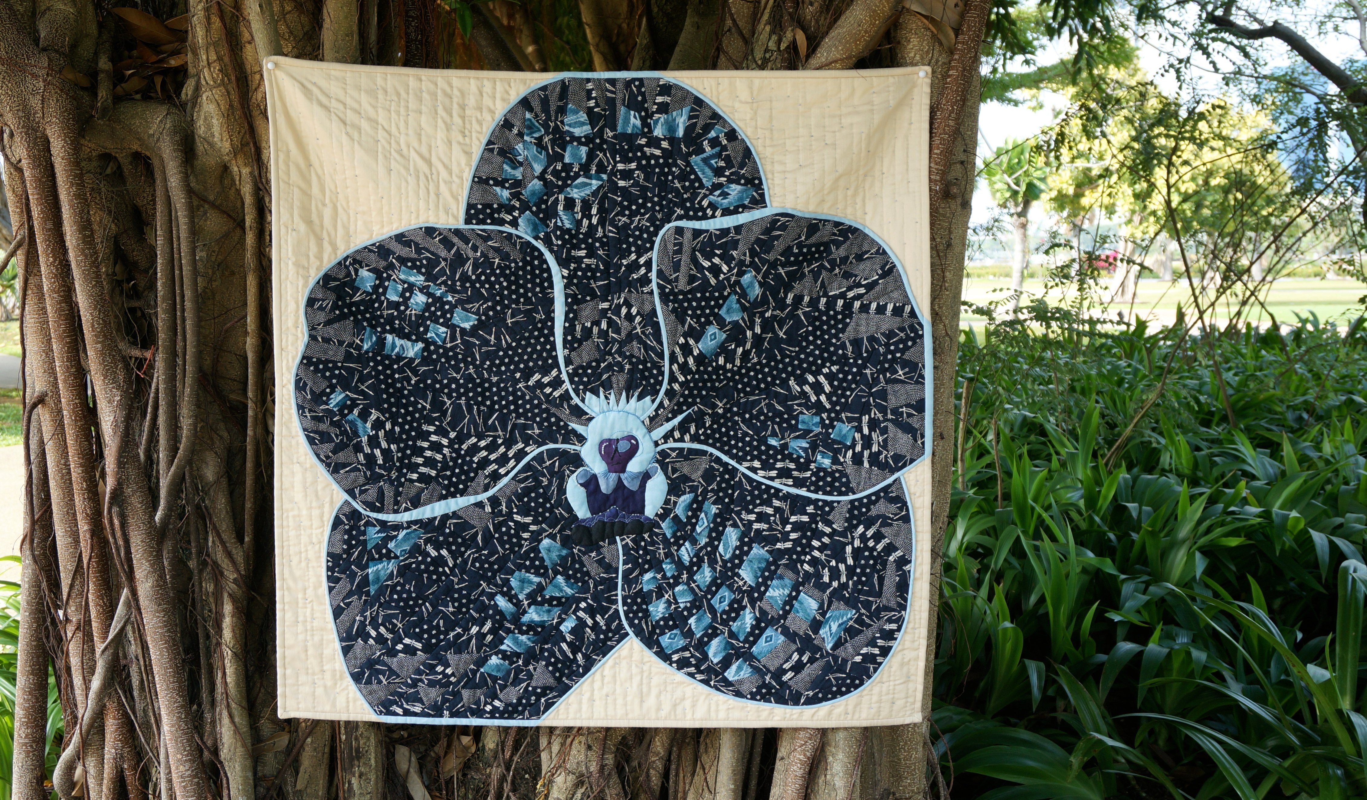 Heatherjl After living in the tropics for many years I have come to love the beauty in the Orchid flower. I decided to try and create a quilt using the Orchid flower and Indigo fabric. I wanted all the fabrics to be pieced so I decided that paper piecing was the best way to attempt this quilt. Working with each petal I mapped out the position of the 5 fabrics that I wanted to use in the orchid. I drew many lines on the paper until I had filled the petal and was able to paper piece the entire petal. The petals were then bound with the light blue fabric to give the outline that I could see in the original photo. The flower petals were sewn together and the centre was appliqued into place. I appliqued the entire flower onto a piece of raw silk and finished it off with machine quilting in the flower. I hand quilted the background with silk thread and incorporated blue beads to give the background some texture. The quilt is bound with the silk fabric and the light blue where the orchid meets the eadge of the quilt.