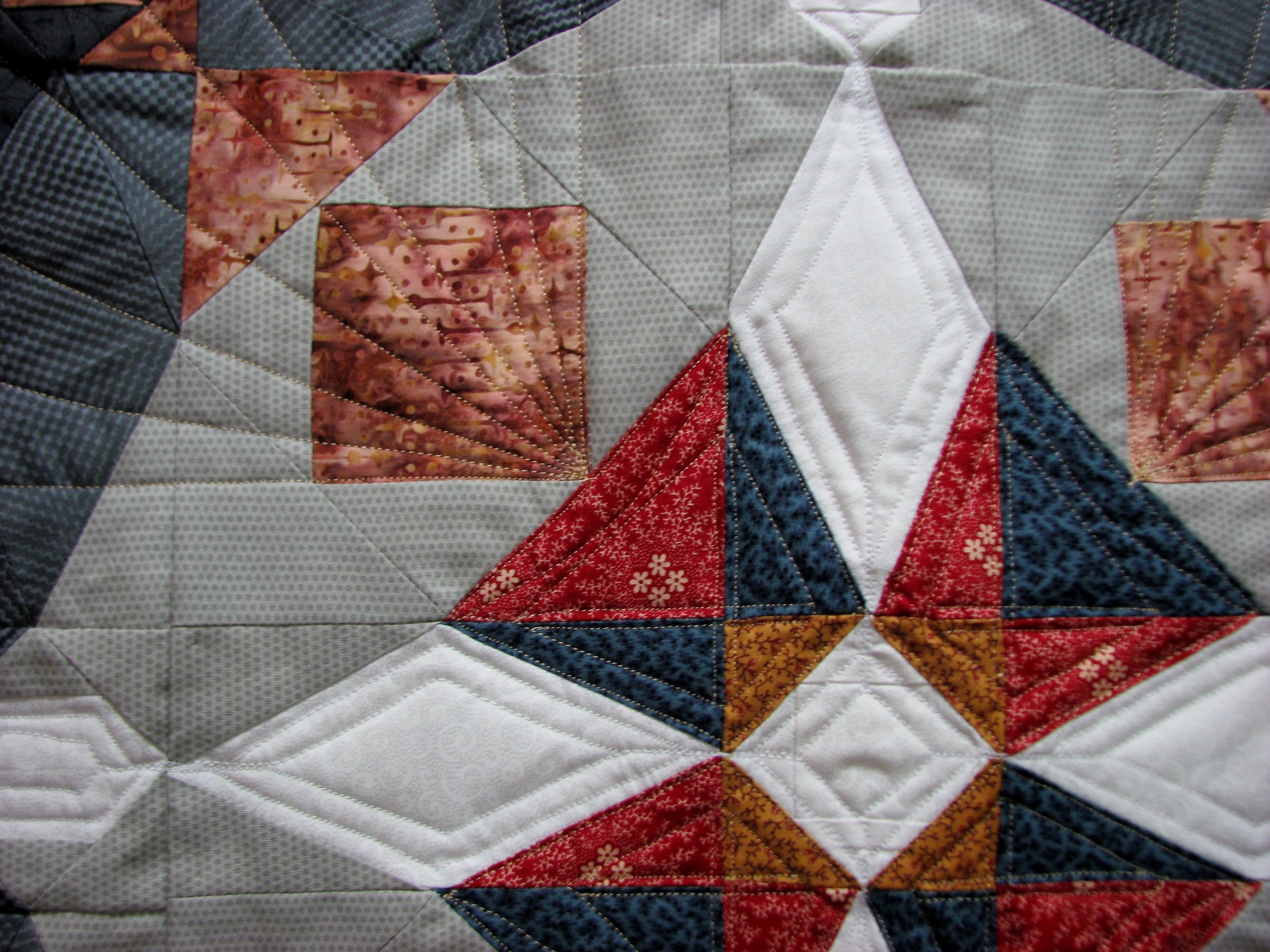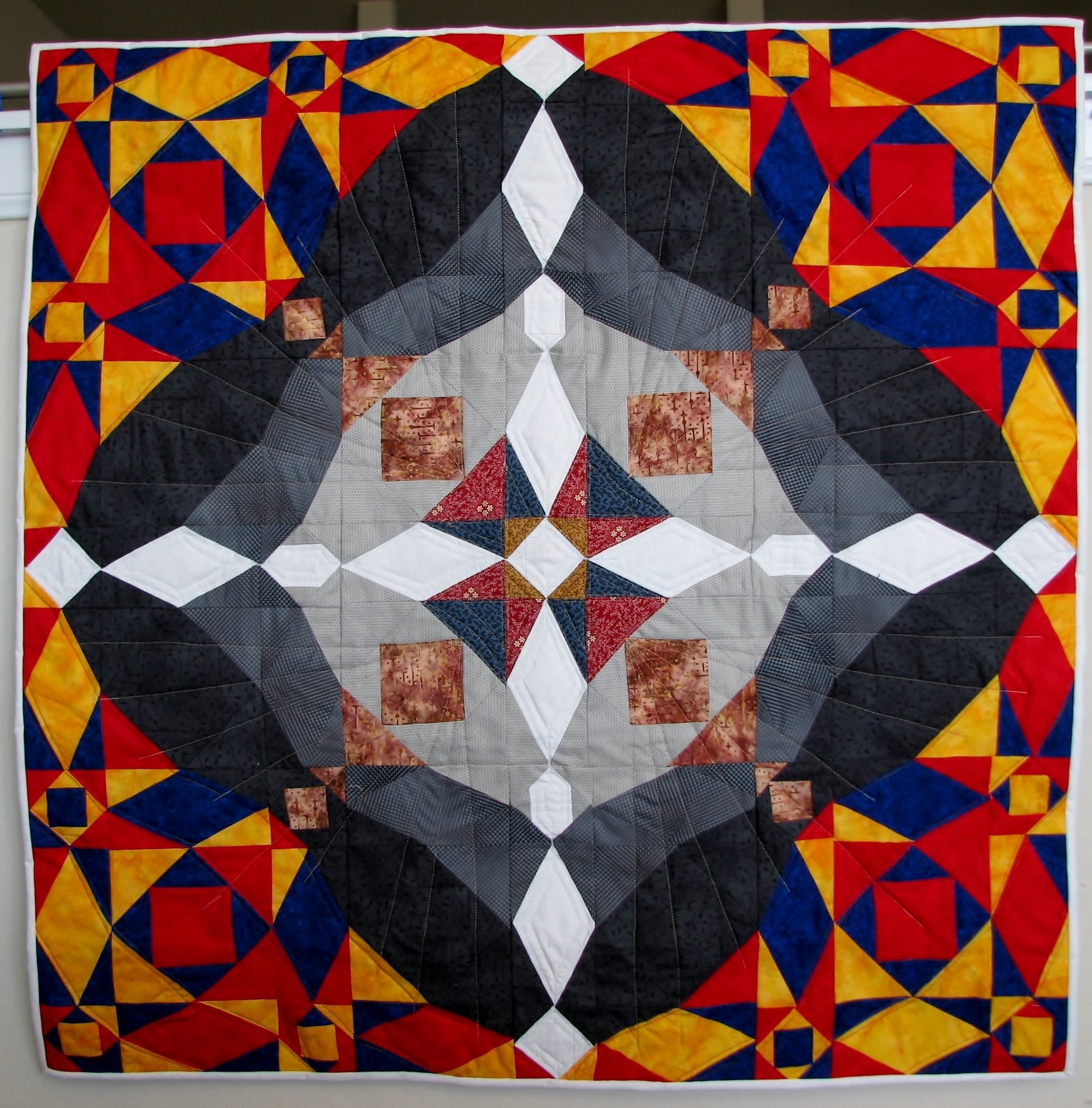 Learning-As-I-Go This is a Storm at Sea setting, in an original coloring design (by me). It's symbolic of what it means to me to be a Christian, how only by loving one another and helping each other can we overcome hard times and get through the dark times of our lives, and that we can only do that by first receiving the love of Christ for us. The quilt is 39" x 39", home machine pieced & home machine quilted.