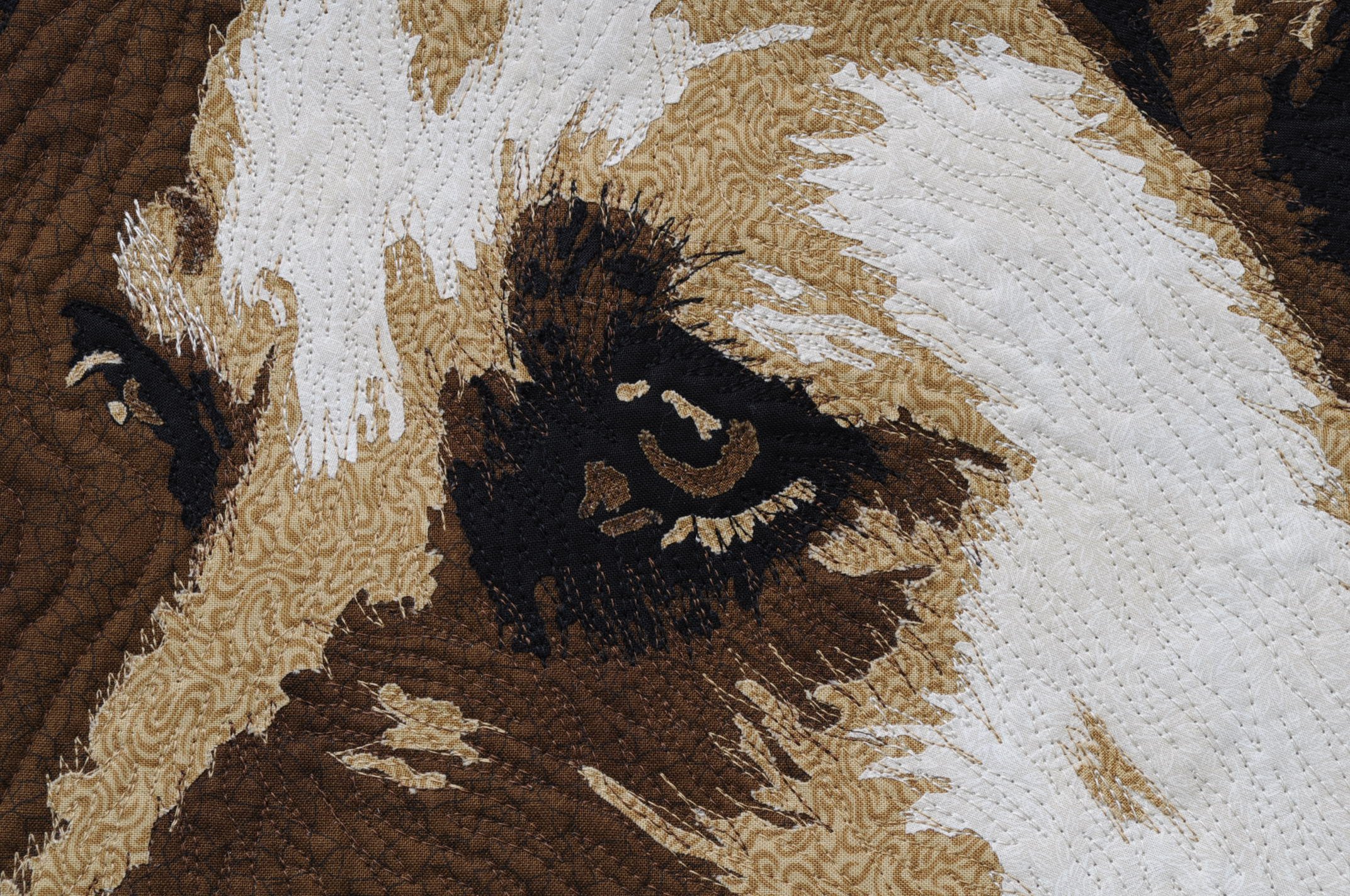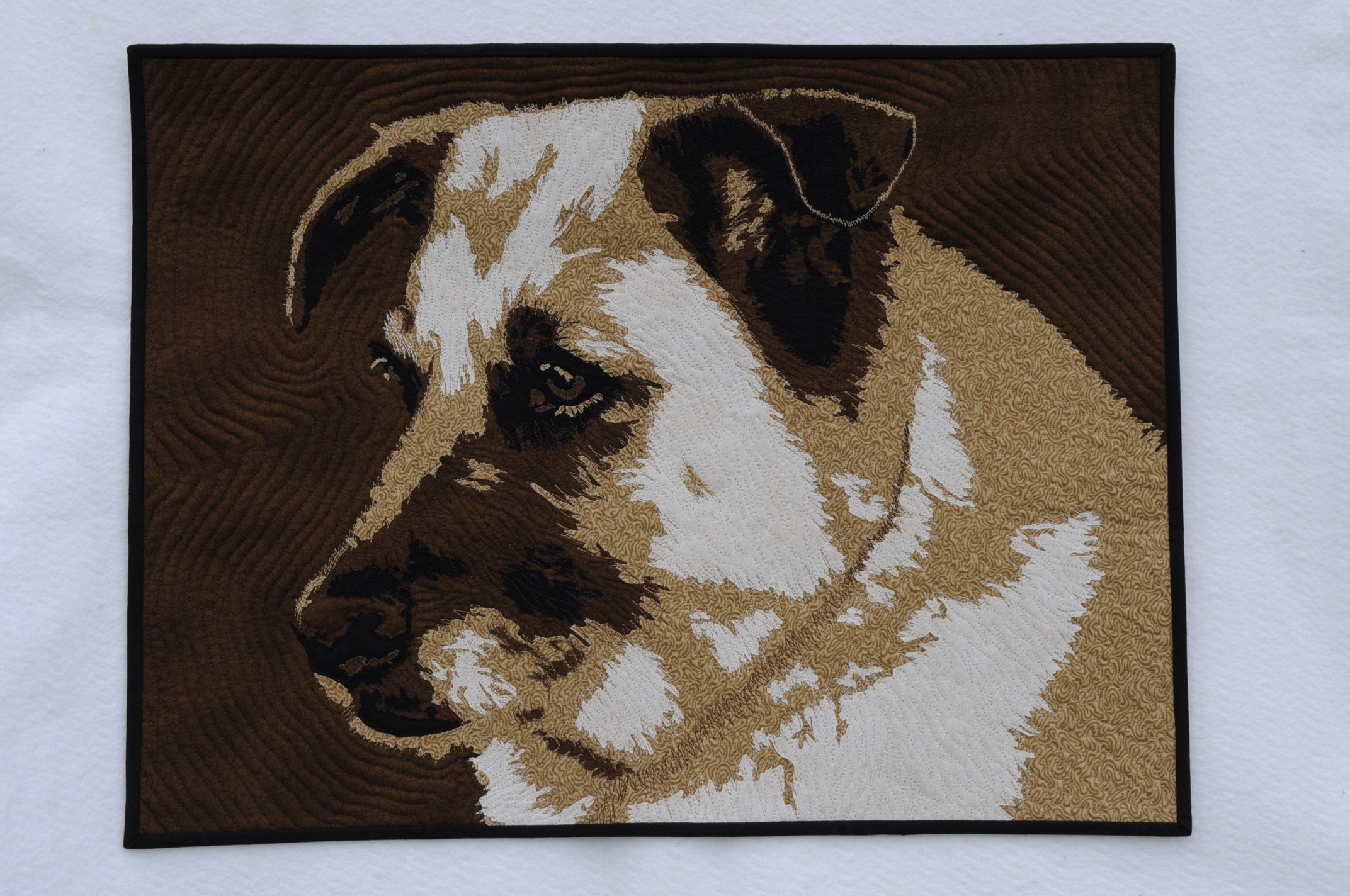 AuntSewsie It was a long wait until Light Steam-A-Seam 2 came back into production so I could make the larger version, 18" x 24", of this photograph. I made an 8" x 10" practice piece over a year ago. I am so happy to have this completed. I think that when I do the next one of another of our dogs, I will make it not so simplified and use more fabrics. But this was a good first project of this type. Whew!