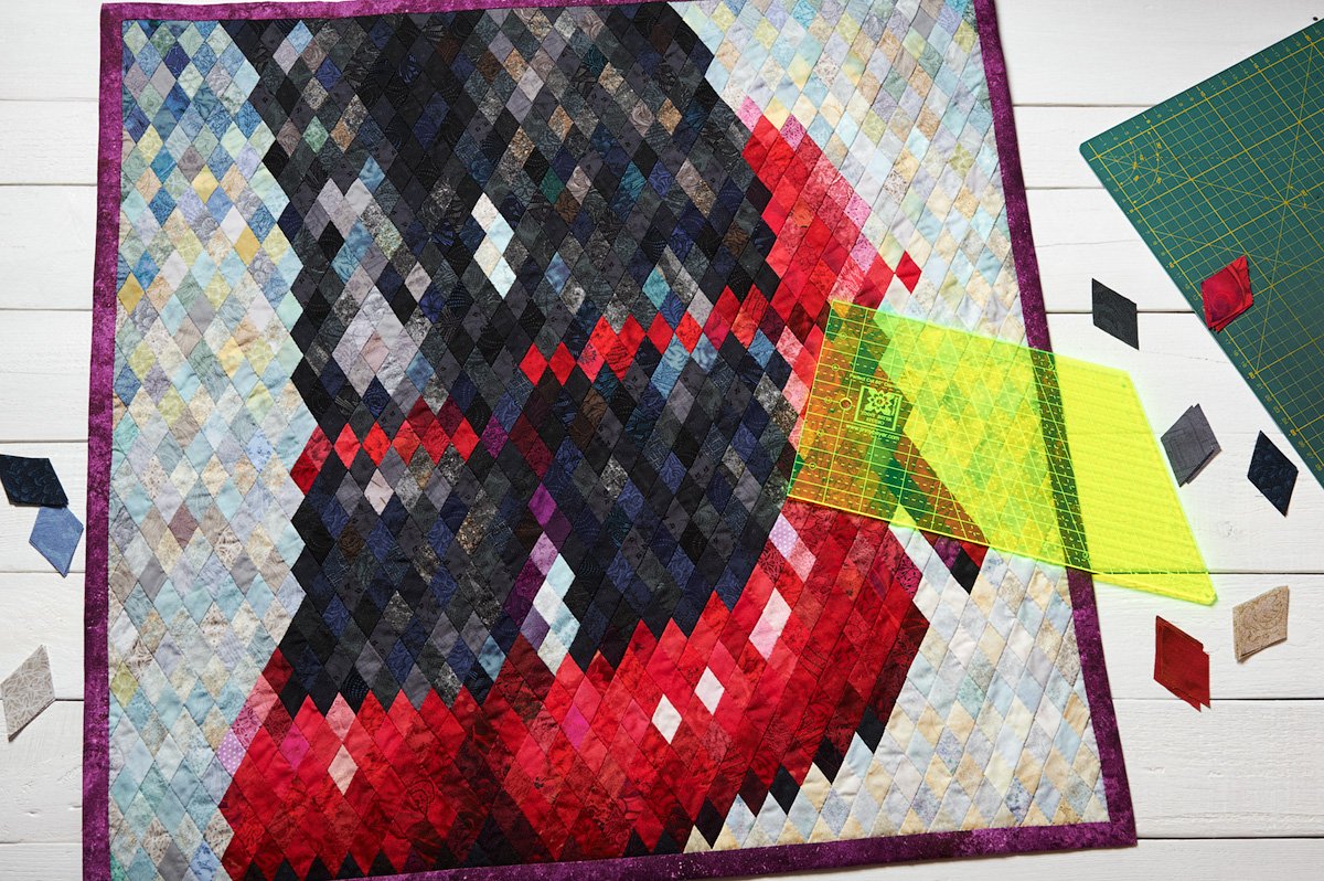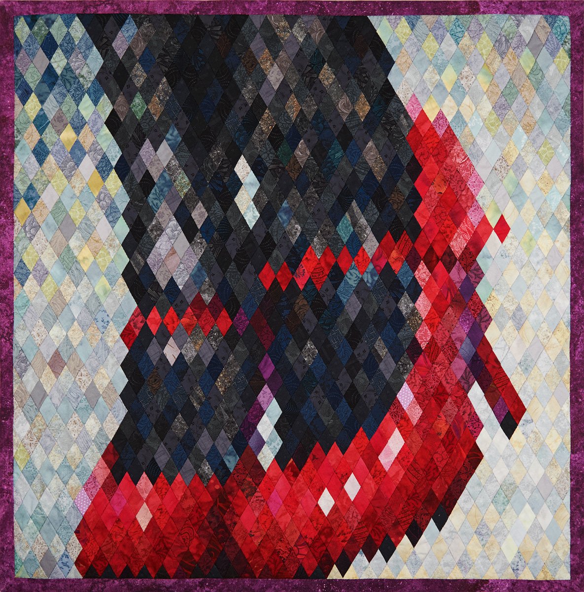 This quilt was sewn to the contest organized by a network of popular shoe stores in Ukraine. According to the contest quilt was to consist of diamonds. Quilt has a size of 27 by 27 inches and it consists of 1236 pieces and sewn by hand. The finished size of diamonds is 7/8 inches.