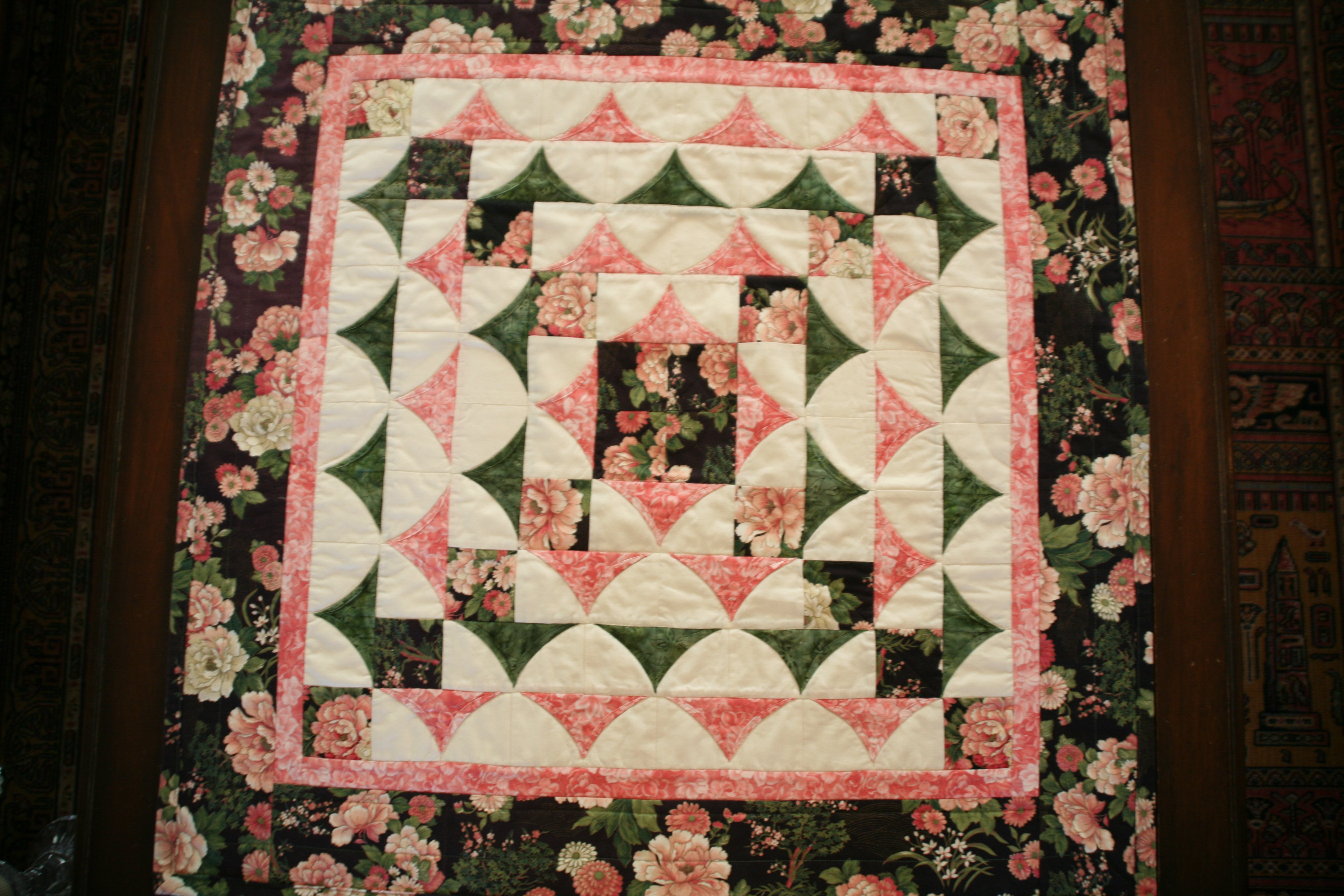 This quilt used my favorite fabric combination, used in my bed quilt, and I've used in quite a few projects. First time making flying geese type blocks that were folded back and stitched making cathedral window type blocks with a contemporary twist to them.