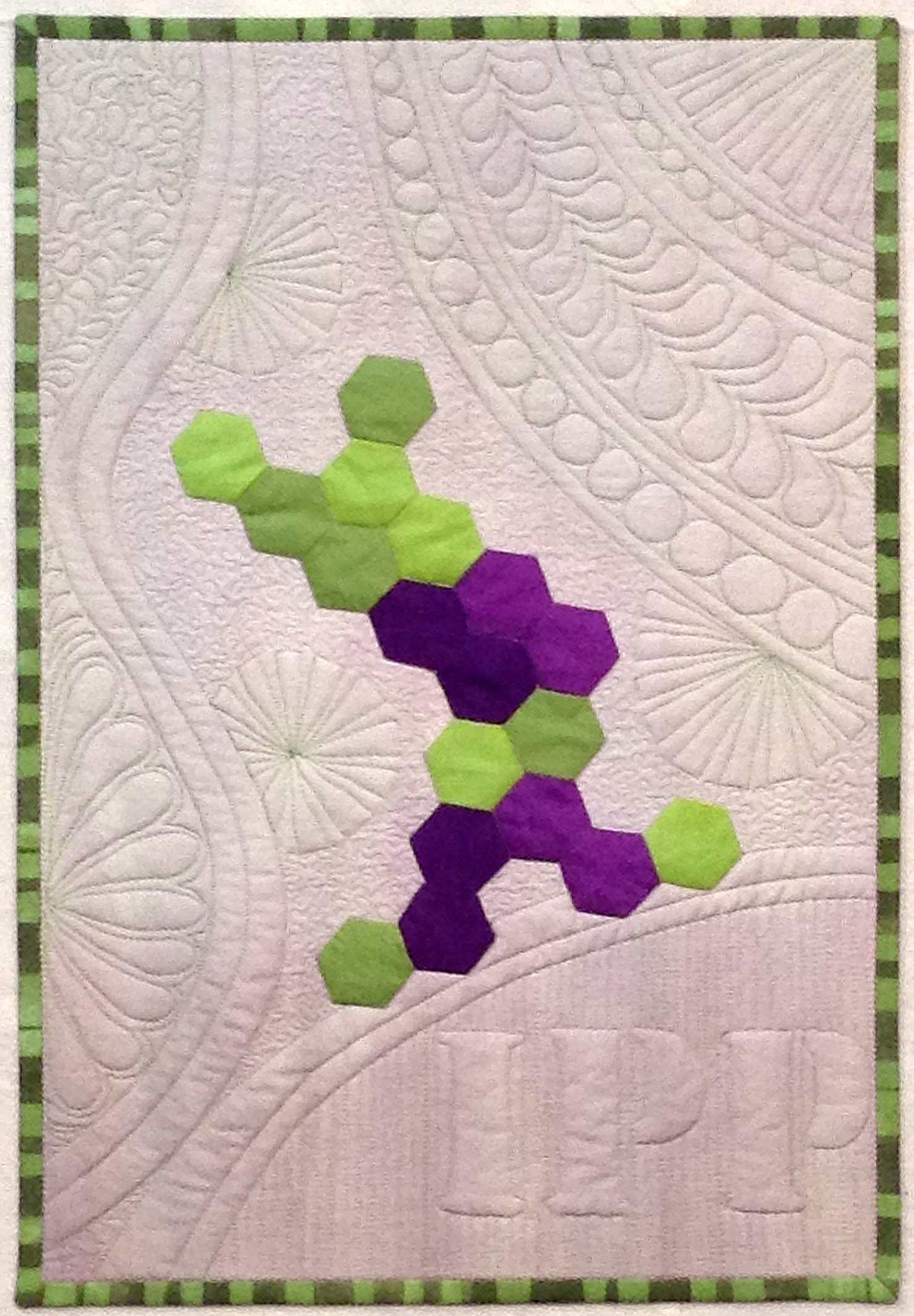 sghsgh This is part of a series of 'DNA' quilts that use hexagons and colors to represent the bases. The first in the series did not try to represent real sequence, but just represented the double helix shape. A more complex one that is still in progress incorporates sequence and a mutation of academic importance to my colleagues. The current iteration, IPP (isoleucine-proline-proline), is simpler, and represents a tripeptide (3 amino acid 'protein') that occurs in milk and has physiologic function. This one and its companion, GSH (glutathione), were made for show and sale in the Baylor College of Medicine Graduate Student Art Show and Auction. Proceeds benefit Texas Children's Hospital. See http://susieturn.blogspot.com/2015/07/more-dna.html for details of design and construction.