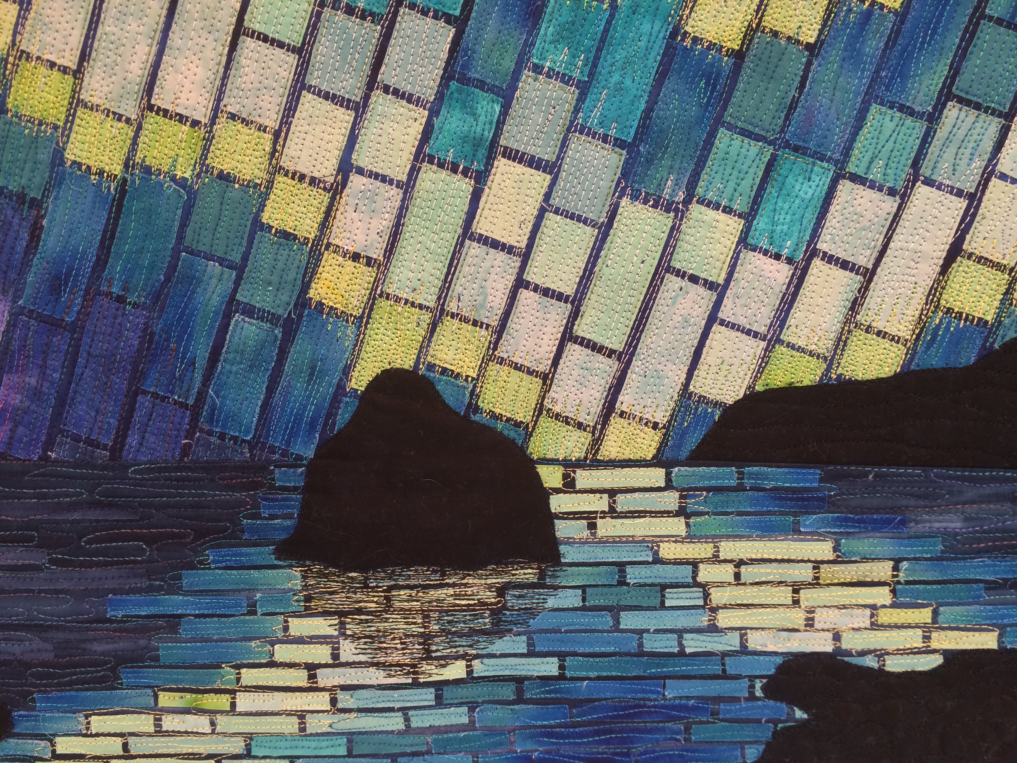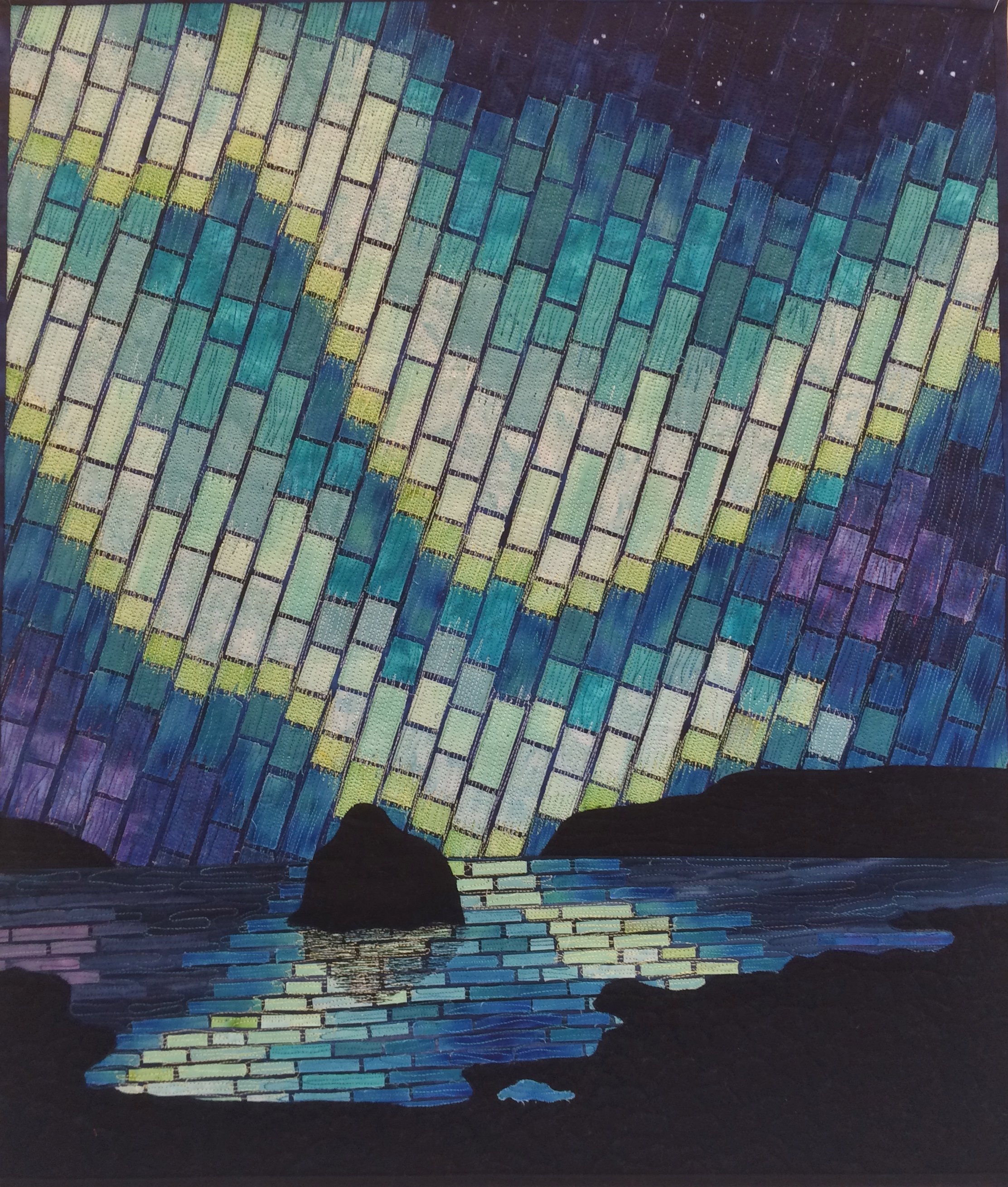 Randam In a workshop on Gloria Loughman's "luminous sky" tiling techniques, I wanted to try something other than a sunset, so I settled on northern lights (aurora borealis), reflected in the ocean along the coastline in Iceland. In addition to the raw-edge applique of the tiling, there's a lot of threadwork on the aurora, to soften or blur the rectangle edges of the tiles a bit.