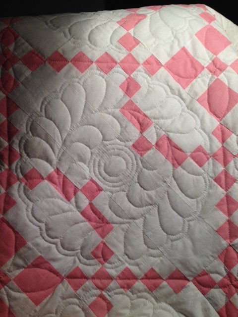mzdetail This quilt top from the 1930s-40s was purchased at the Dallas Quilt Show in the mid 1990s. I finally made the back and marked the quilting with a design I found in American Patchwork & Quilting (Feb 2014). I am part of a group of 11 women who meet weekly to hand quilt on a frame--we go from one home to another and work on one person's quilt until it is done. Raspberry Sorbet is a Burgoyne Surrounded pattern and was finished in the Fall of 2014. I almost hated to sandwich it and quilt it, because the original maker hand pieced the entire top with the tiniest, most perfect stitches I have ever seen.