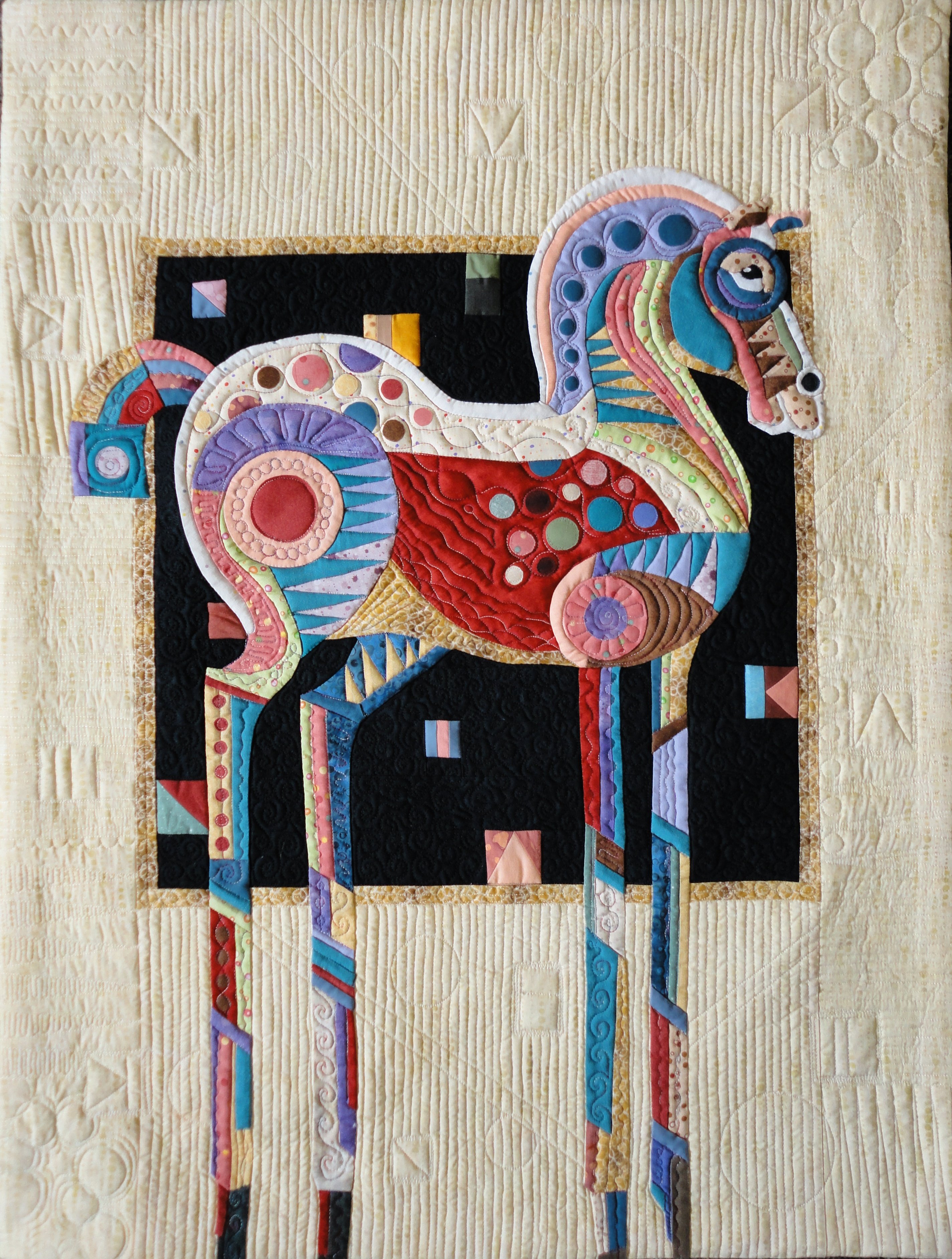 elsiequilts In 2009, artist Bob Coonts gave me permission to use his stylized animals (found online) as insporation for art quilts. This quilt is the second one and was inspired by my local guild's challenge in 2014 with the theme "DOT." Drafting the pattern was easy, but assembly another story. However, I had so much fun making it that "Spirit Stallion II" had to be renamed "Horseplay." This quilt won two ribbons in that challenge, one for most effective visual impact, and the other was 'viewers' choice.'