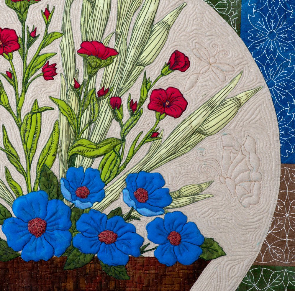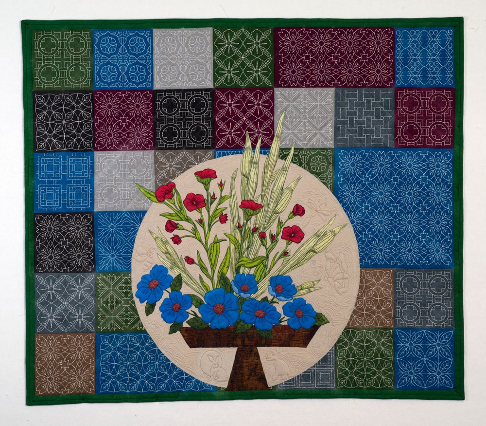 A quilt honoring the Japanese women in Kanazawa, Japan, who not only taught me Ikebana but also how to manage a Japanese home more than forty years ago. Made from Peppered Cottons (a soft loosely woven cotton), commercial embroidery designs from OESD for the Sashiko embroidered blocks, digitally painted flowers printed on cotton and arranged in situ on the quilt top in the Japanese style vase constructed from hand dyed dupioni silk.