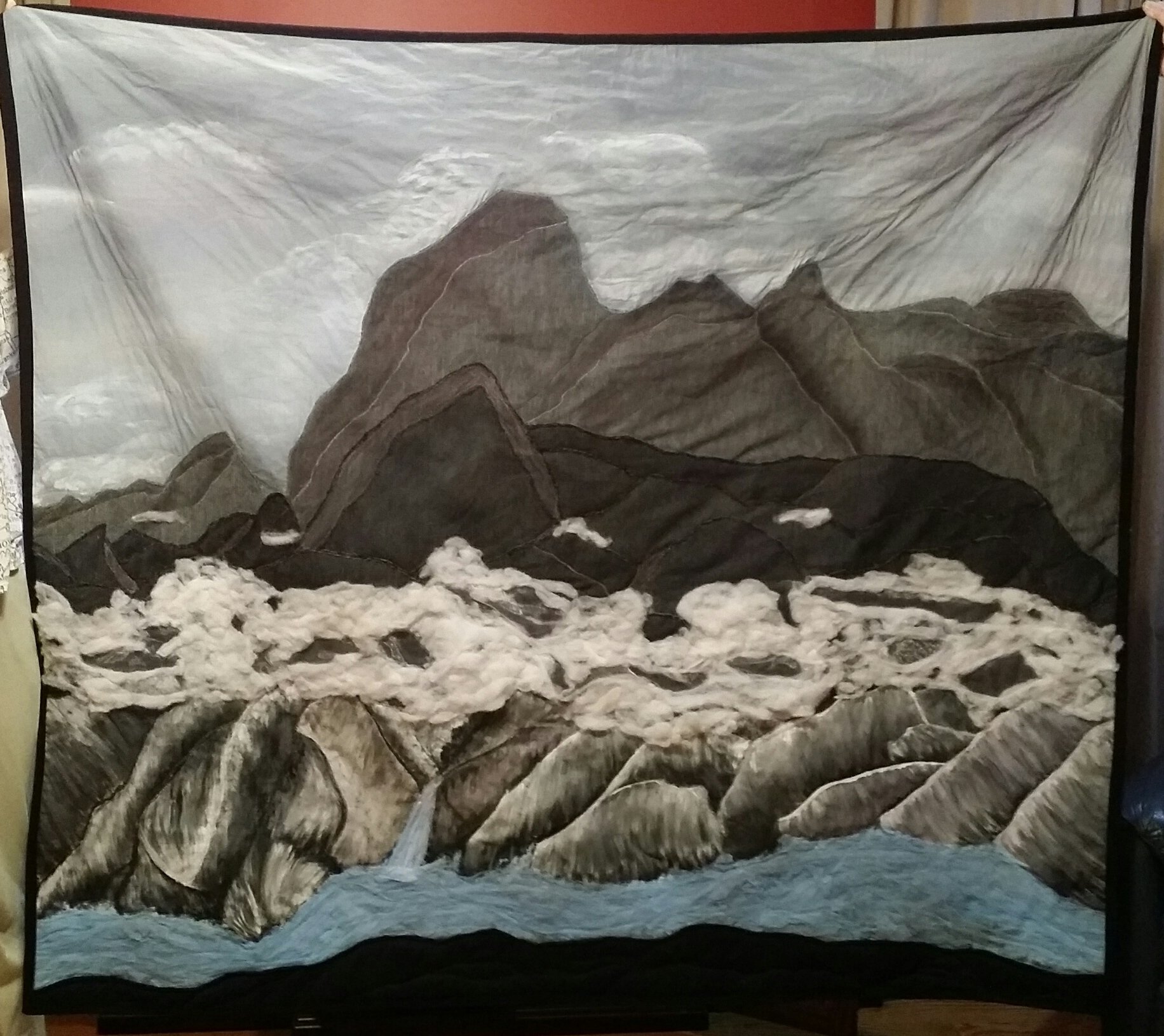 sumcoop This is an mixed media art quilt. 60x72. I have used acrylic paints, applique, oil paint sticks, thread painting, and quilting. The quilt is three dimensional using toile for the water, I completed this last year.