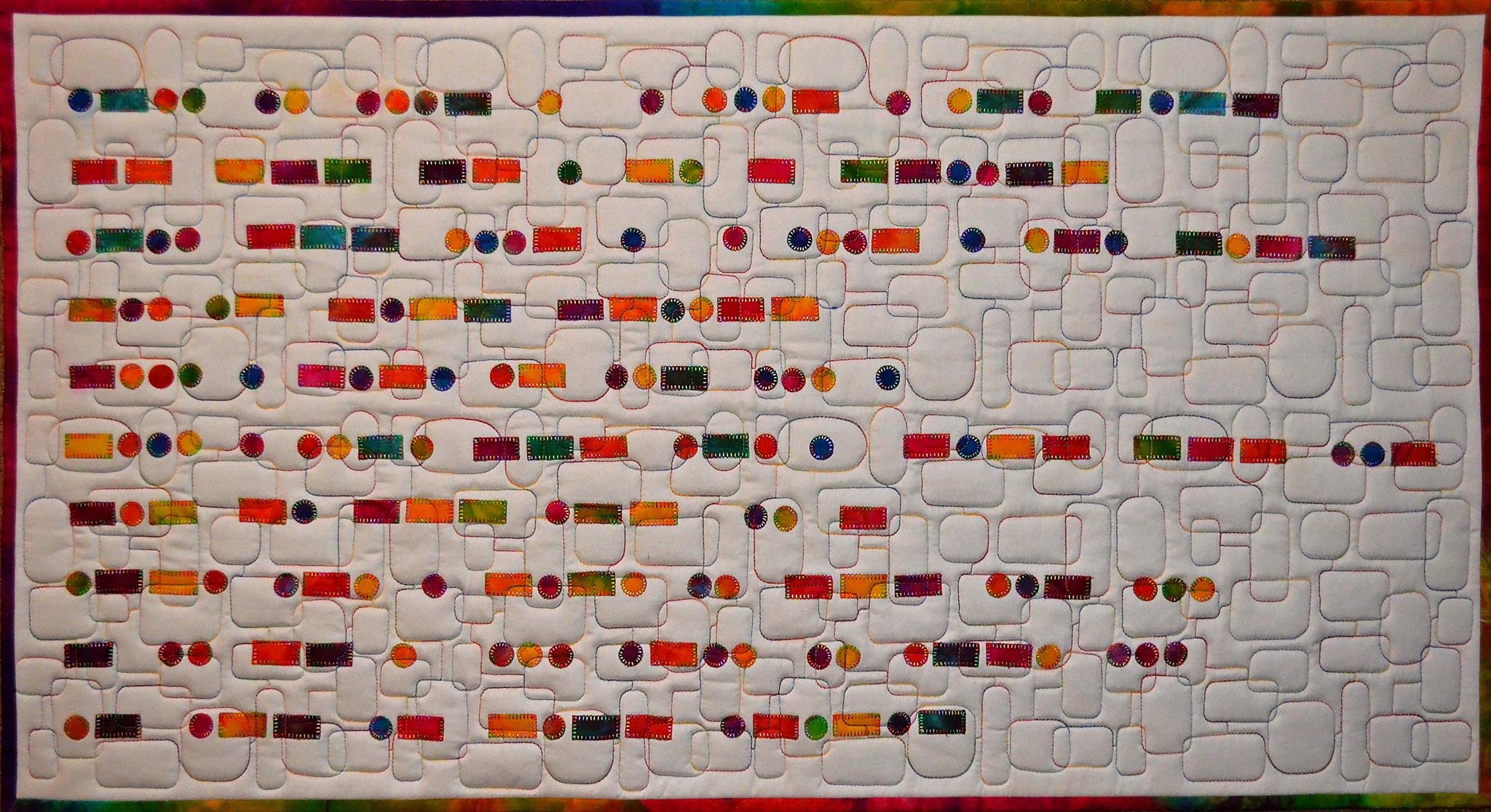 CMOELLERS This is my 2015 IQA silent auction quilt I am calling "Dots and Dashes". It is a modern art quilt with an important message. There are times we get lost in all the chaos that goes on in our life. We need to just stop, take a moment, pause, and reflect on what is important in life. "Dots and Dashes" spells out a message in Morse code. It says, "Live every moment, Love every day, Because before you know it precious time slips away." It was a fun quilt to make. Measures 17" x 31".