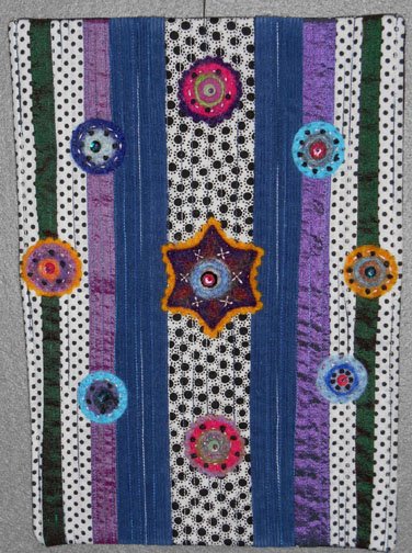 It is about 5 inches x 7 inches in size, and has black and white cotton fabrics, dupioni silk, and narrow corduroy fabrics. It has machine and hand needle-felted embellishments, with some hand embroidery, and buttons.