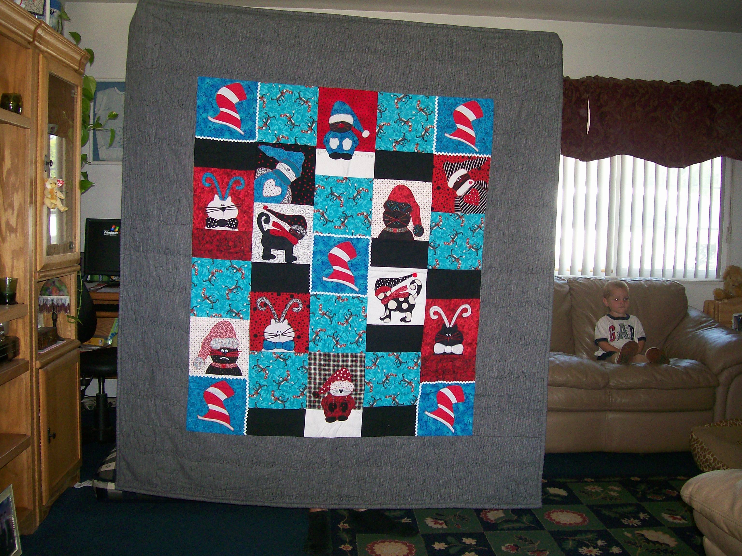 a quilt inspired by a Christmas cat quilt pattern but not liking a quilt used one month a year....I changed the xmas thing for the cat in the hat hat that I designed. I changed a few things on the pattern.