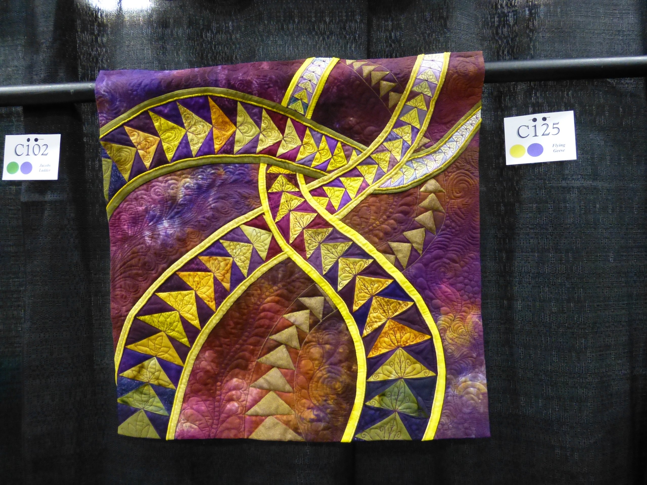 This quilt was a guild challenge for our 2015 show. It had to be 24" sq., have a traditional block in it somewhere, have no black or white, and be made from only two colours chosen randomly out a paper bag. We could use any tint or shade of those colours. It was a very good lessson in using the colour wheel. I was also exploring how to get depth and movement in my art.
