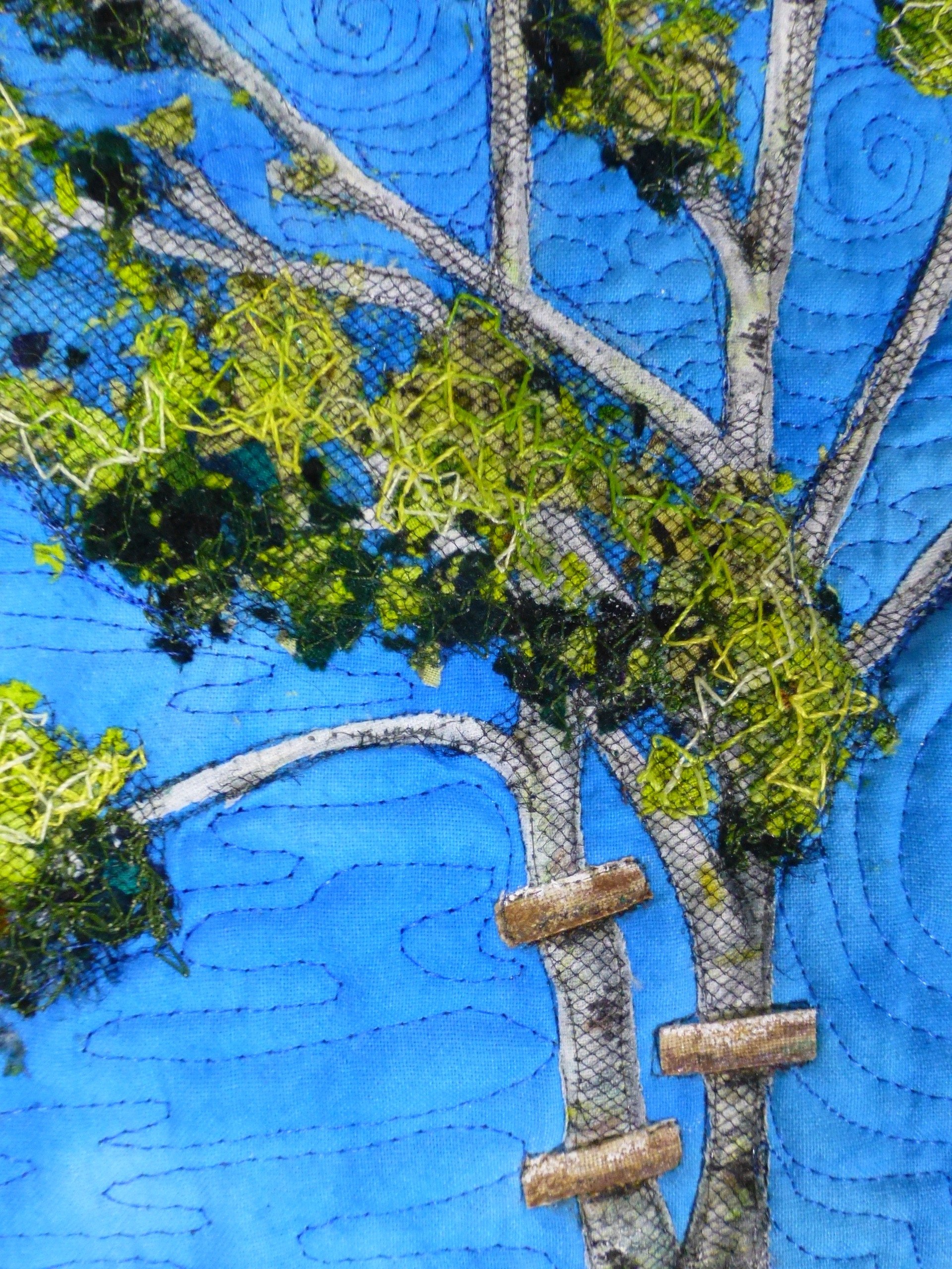 This quilt was made for a friend in memory of our childhood and her mother. We would spent many happy hours climbing the birch trees in her back yard and swaying in the breeze. Her mother always supported our wild escapades, including building a tree fort high up in the branches. Can you see the steps we nailed in the tree to get started on our climb? We share strong roots.