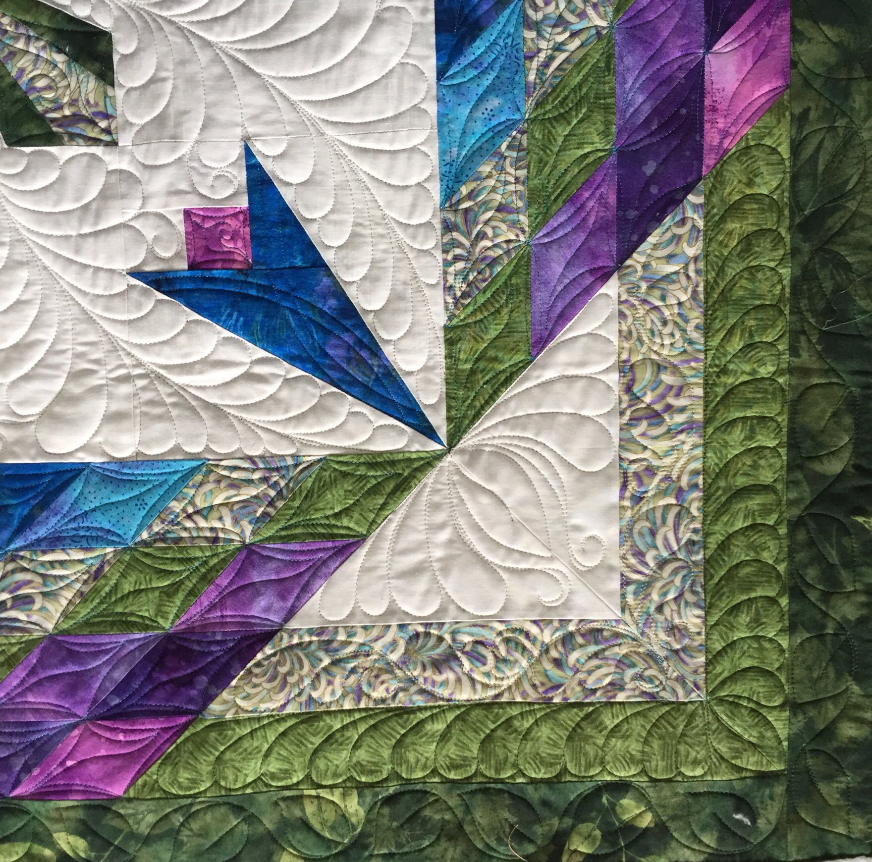 I designed my own paper pieced setting squares and am very happy with the result. I liked it so much I asked a wonderful long arm quilter in our guild, Merry Jo Rembold to quilt it and the quilting is gorgeous - makes he quilt!