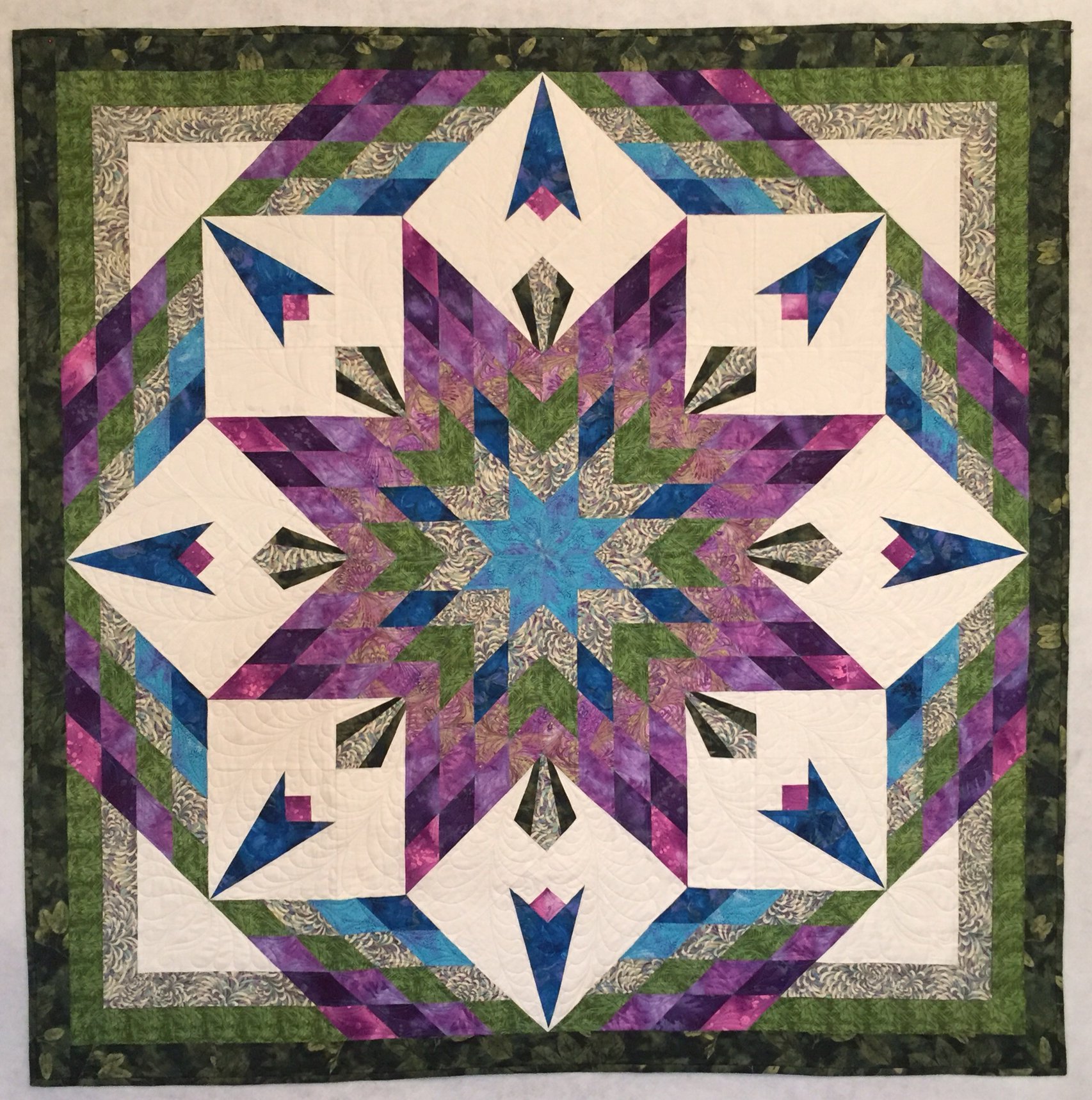 I began this quilt in a Jan Krentz Summer Salsa workshop in 2006 and finished it in 2015. the pattern is involved but not that difficult. Lesson learned - it's hard to pick up where you left off!