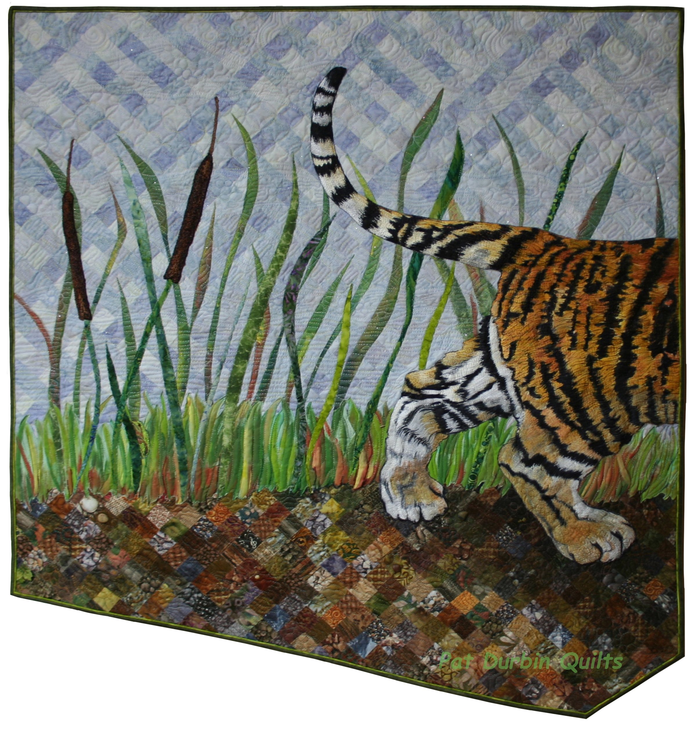 Baby tiger walking along the marsh--tail a wagging. The sky is woven, the ground mosaic pieced, the tiger painted with lots of thread painting.