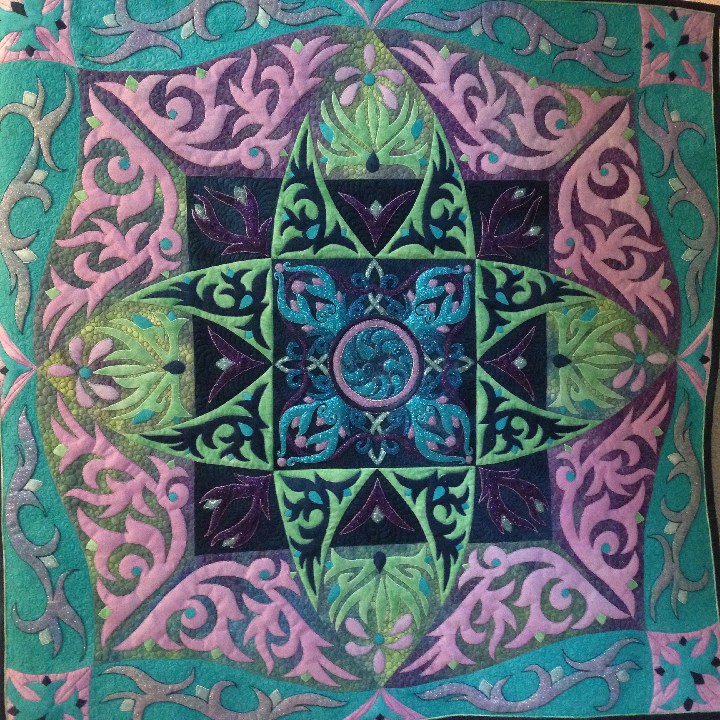 A modified version of Ricky's Lady of Shalott quilt. I chose to do solid, elaborately quilted and glitter-painted pieces instead of the log cabinish pieced center. The quilting designs were also my own.