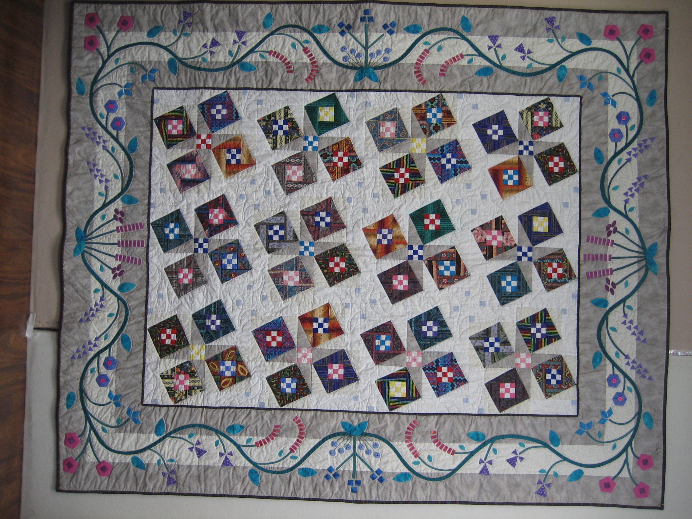 This was the 2015 Block of the Month four-part pattern named Blooms for Julie. I was able to use fabrics from my stash, especially border prints collected at a previous quilt run. Lots of fun techniques were used such as making templates and using them to cut patches, several ways to applique, bias strips, partial seams, working with stripes, and creating 3-D yo-yo and folded-hexagon flowers. This was my first attempt at raw edge applique.