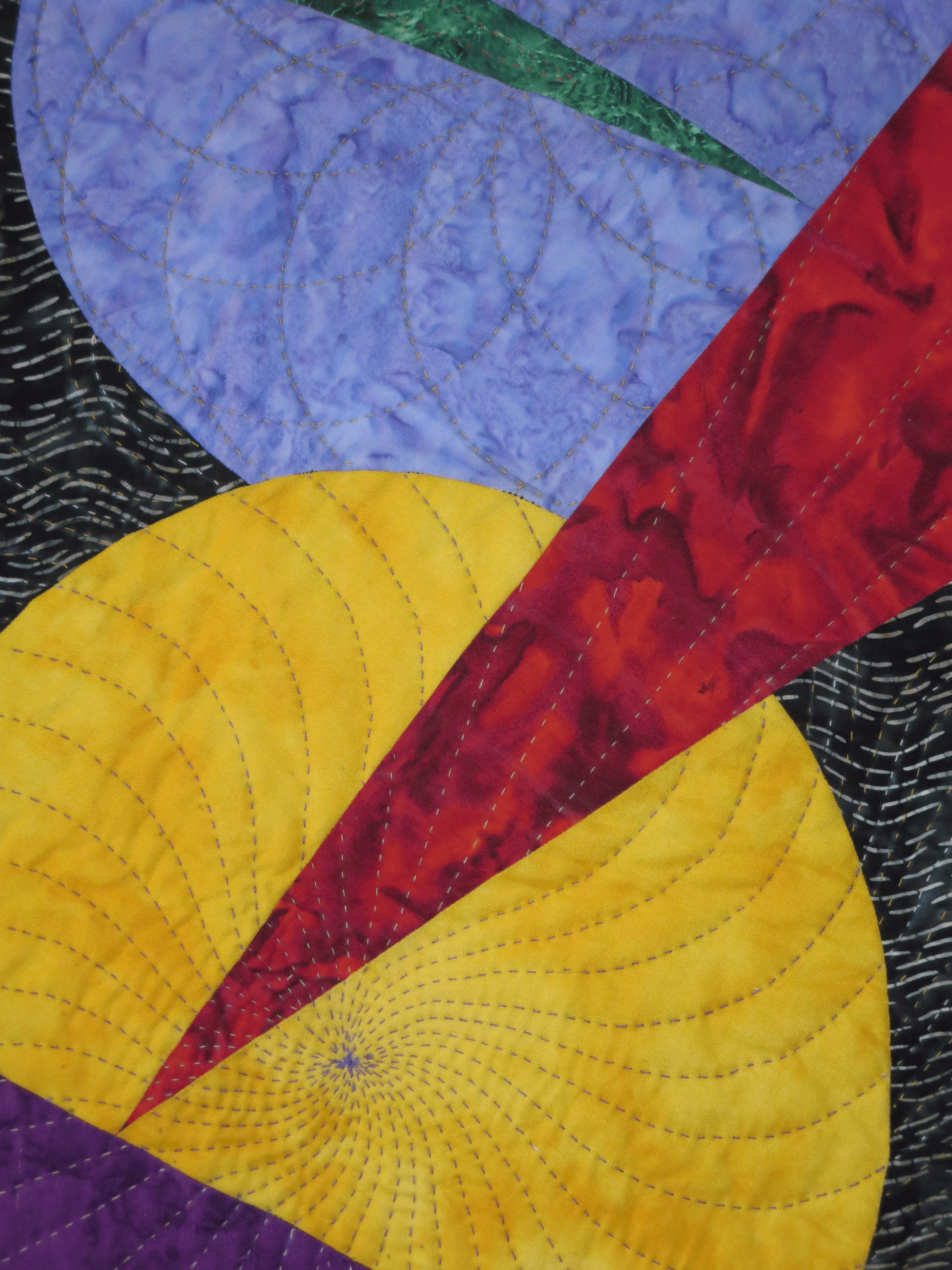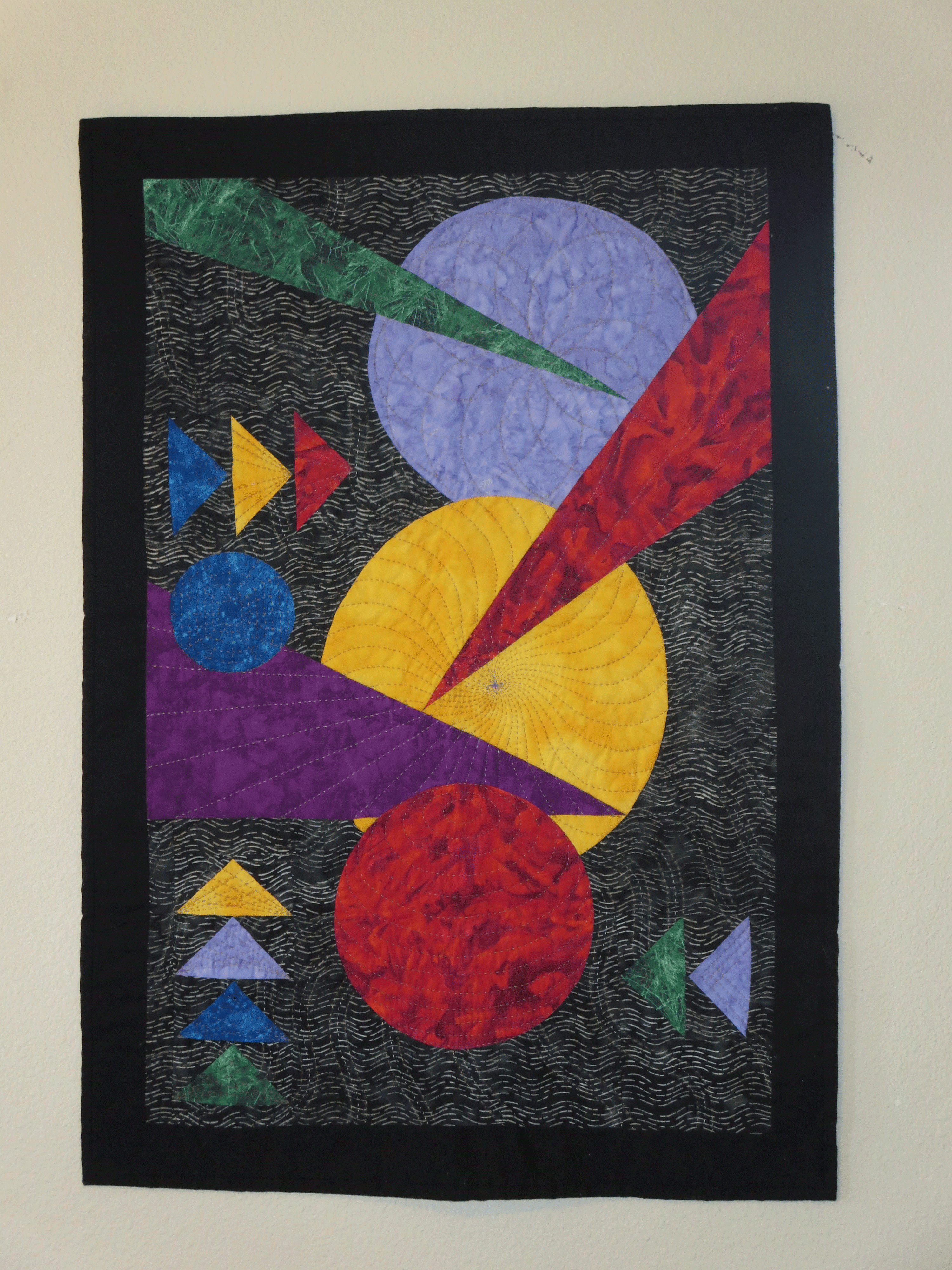 I included the "Flying Geese" traditional blocks in the "Modern" pieced design. It reminds my son of when the planets align. This quilt certainly challenged my skills in conjoining, so I call it "Conjunction".