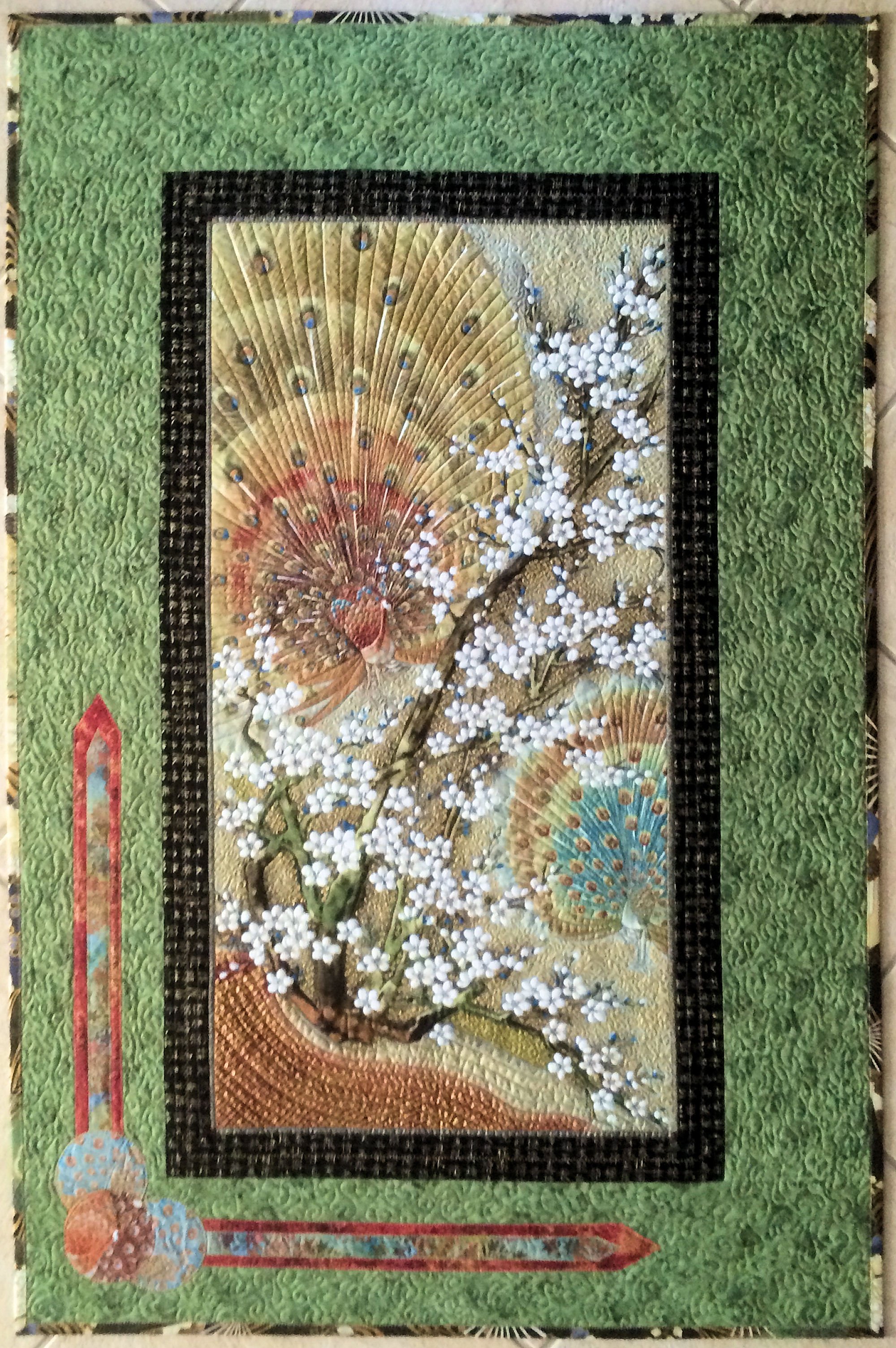 This quilt is a wall hanging I made for a friend who loves peacocks. She and I met through Mah Jongg so the Asian theme is perfect for her - we are Birds of a Feather! The center was a purchased panel that I quilted heavily on my domestic machine, adding borders and appliques for accent.