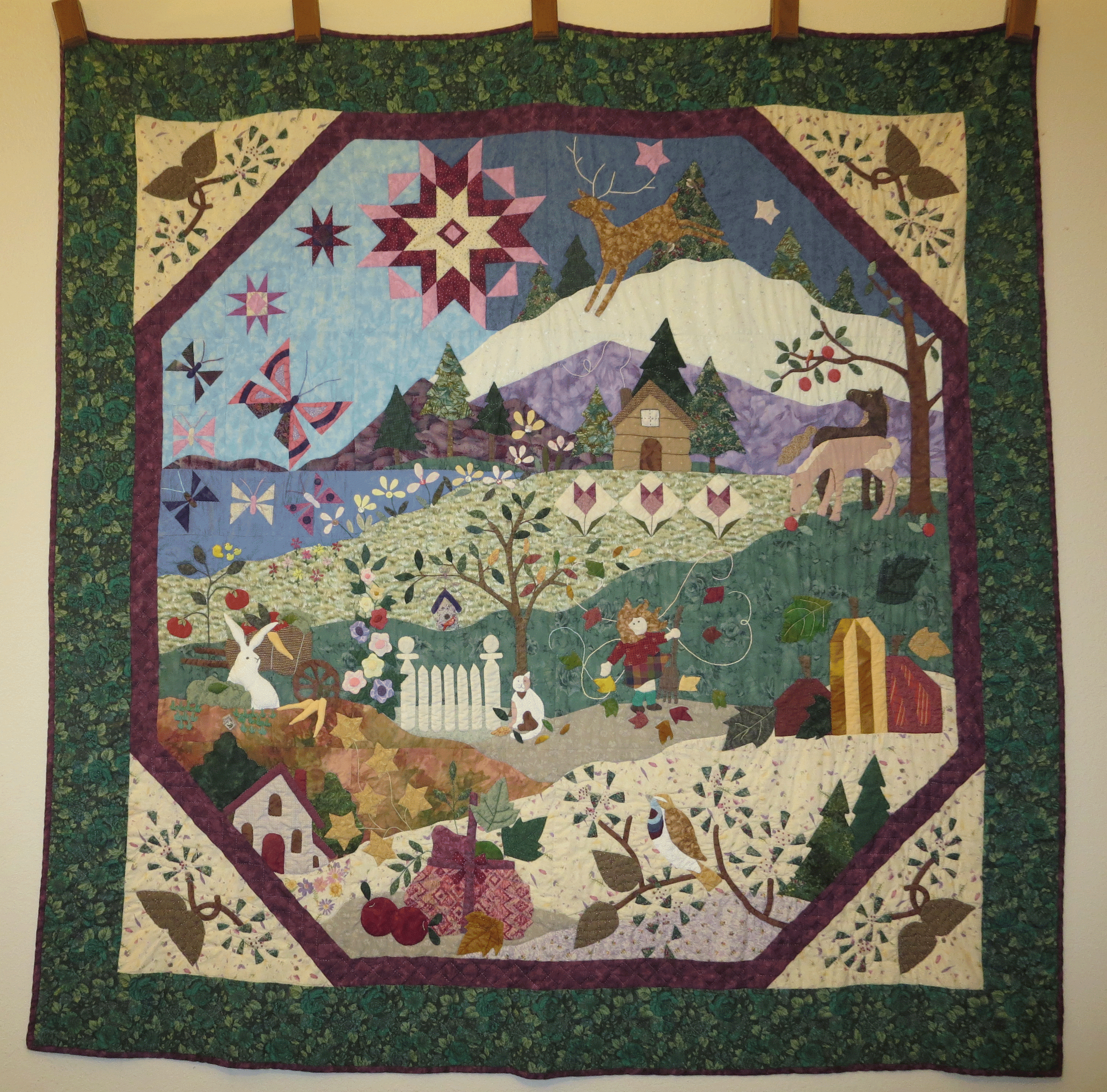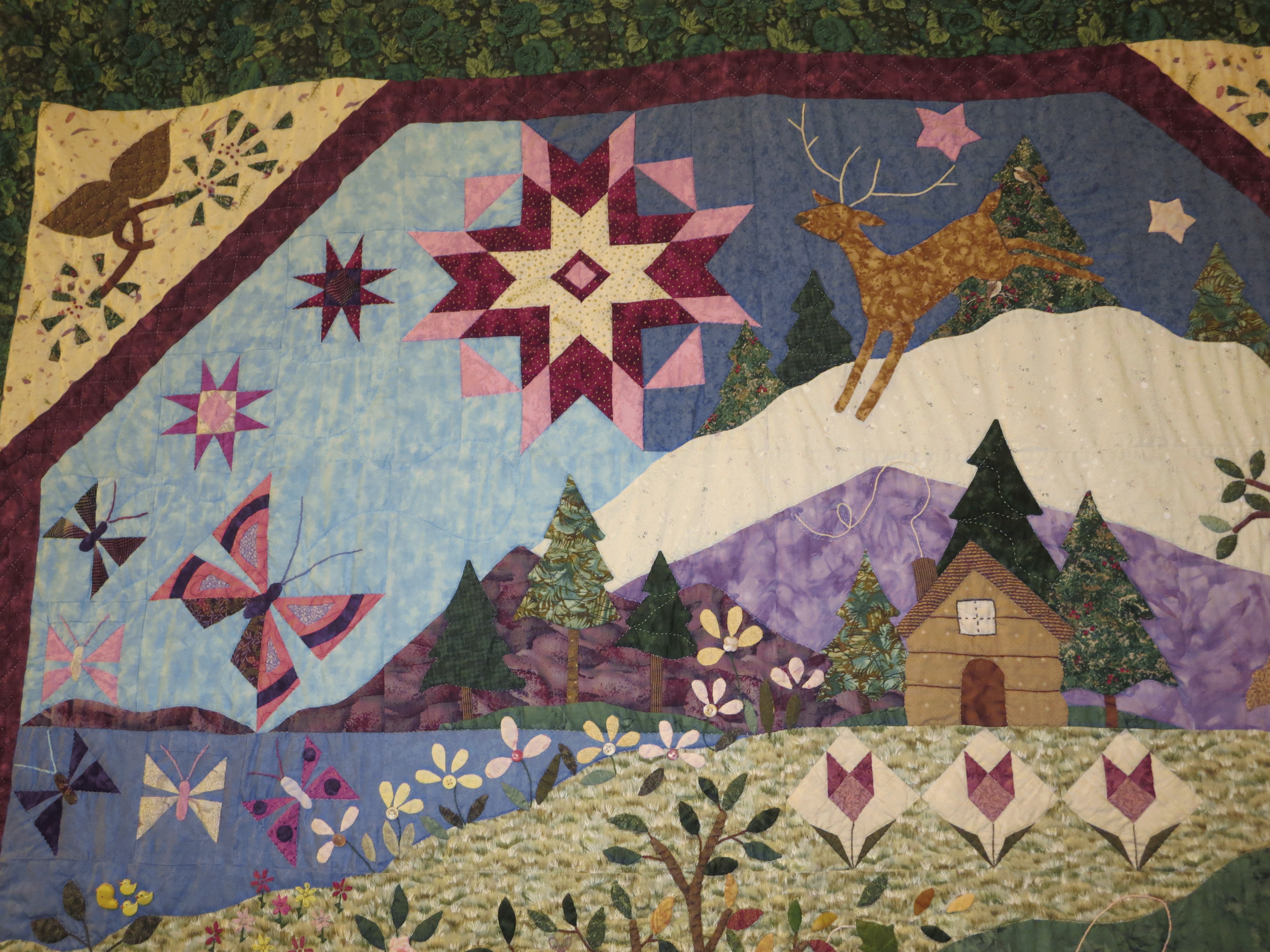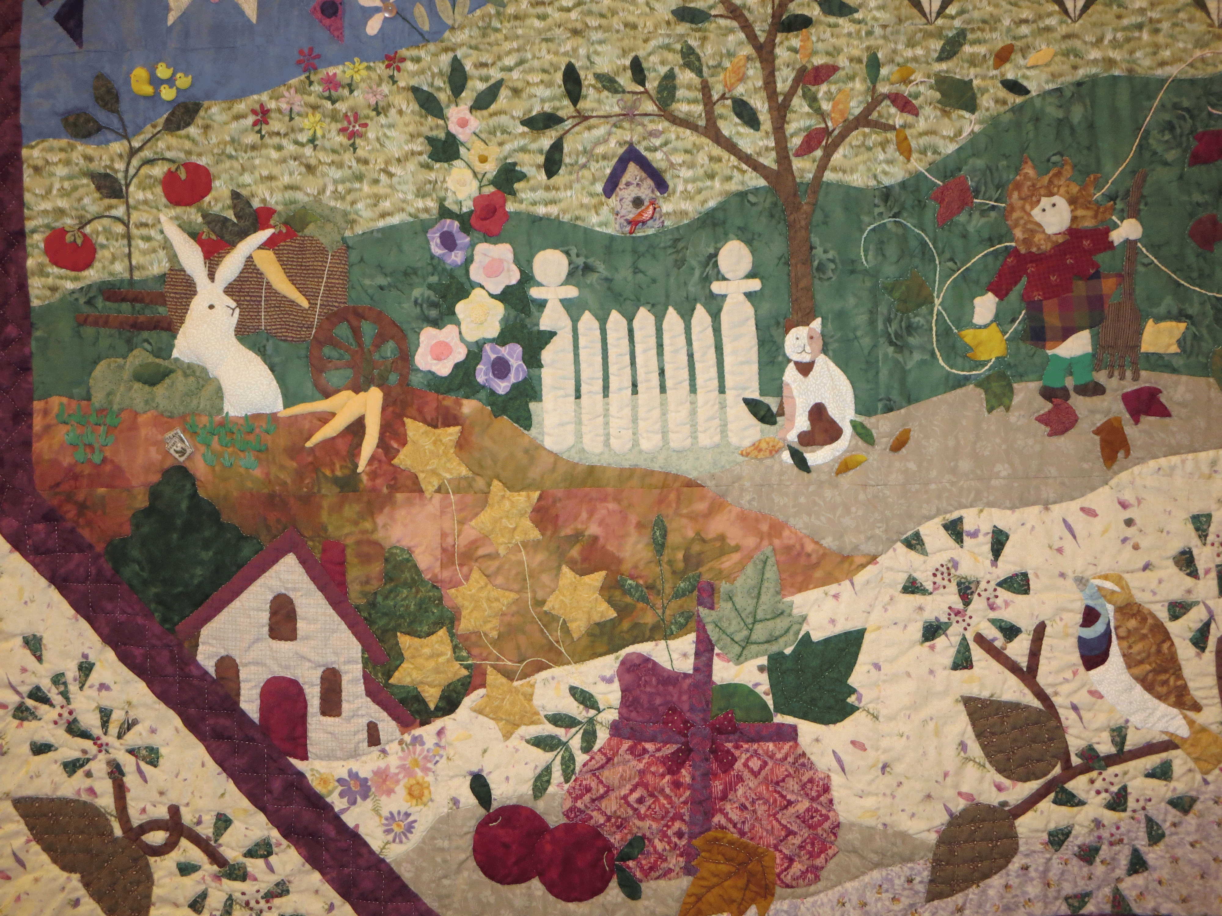 The blocks blended together between the blocks. The lines of the background were matched together and some appliqué was added between two blocks after they were completed. It was hand quilted after the whole top was completed.