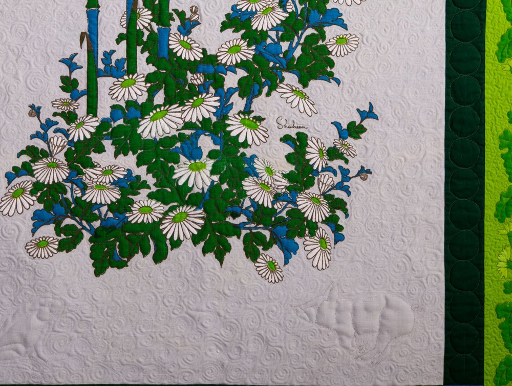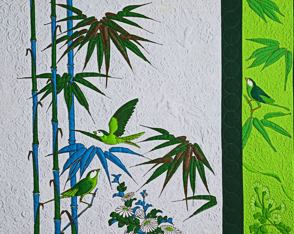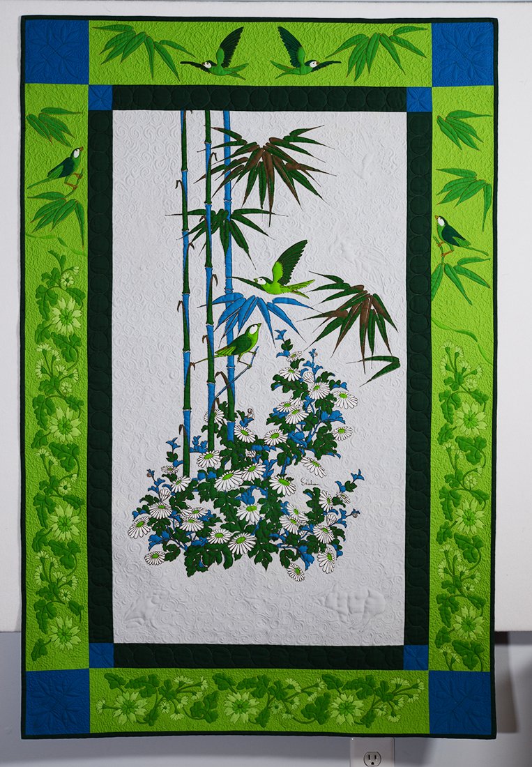 MQX NE 2016 has called for quilts in their Alfred Shaheen Vintage Panel exhibit and I decided to make one just for relaxed fun. After it was finished, I decided to enter it into the juried part of the show because I liked the way it came out and they waived the entry fee, so why not. I found my beautiful linen panel online and designed the borders around it. I was fortunate to find exactly the right solid colors for the borders, and so I quilted, then painted the light green border. The dark green border is my first venture into ruler work for a show quilt, since all I did was make a row of touching circles using Lisa Calle's new circle rulers with my Bernina 830. They are hard to see, but I quilted in a frog, a pig, a parrot, and a flying bird in the white background of the central panel and then did a circular twirl fill with that. Fun to make...since I'm competing against some of the country's best quilters, I would be really surprised if it wins anything, but that's ok. It makes me happy. This quilt will be available for purchase on my shop after it finishes its show season (it will be shown in the fall MQX also).