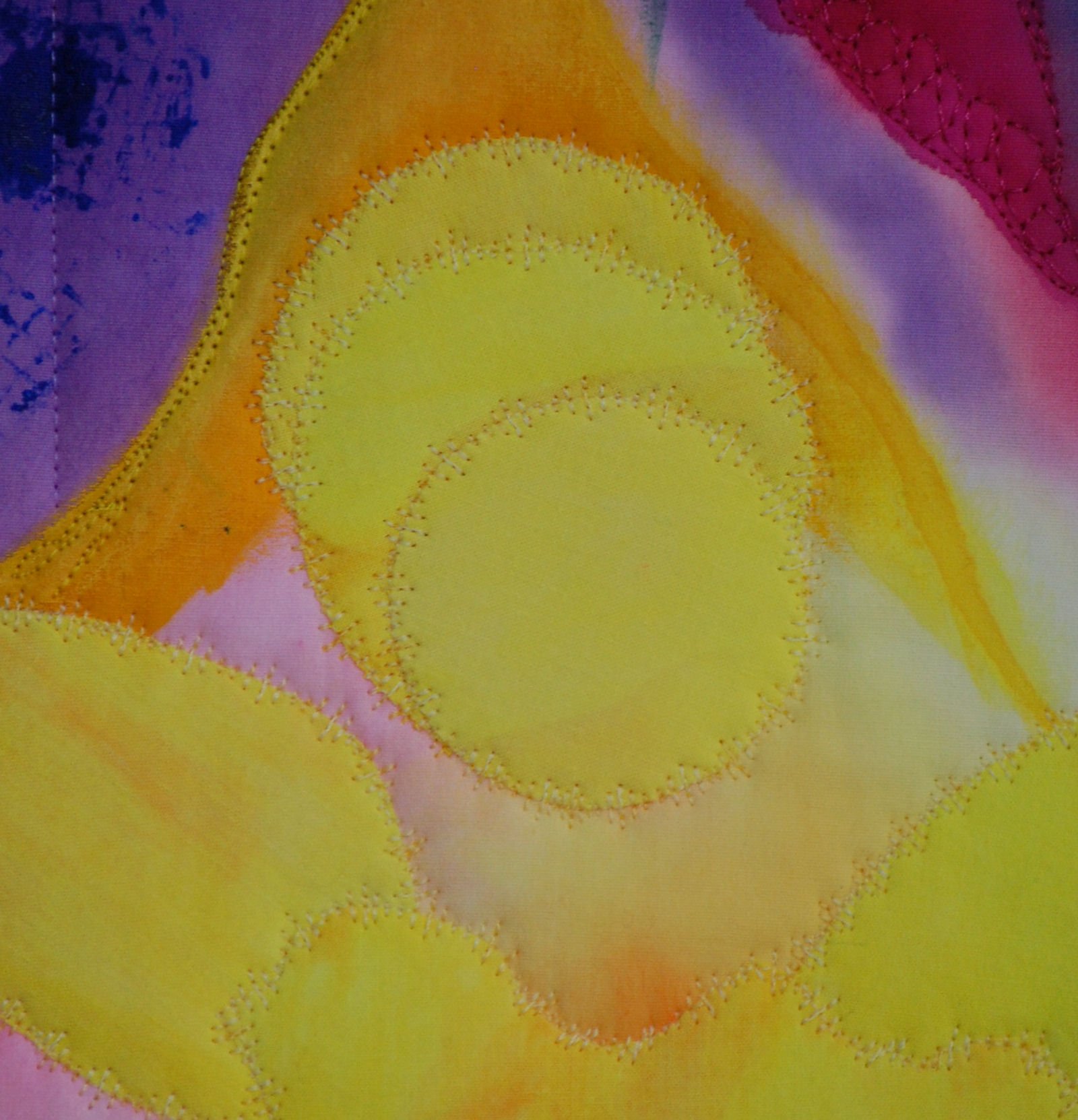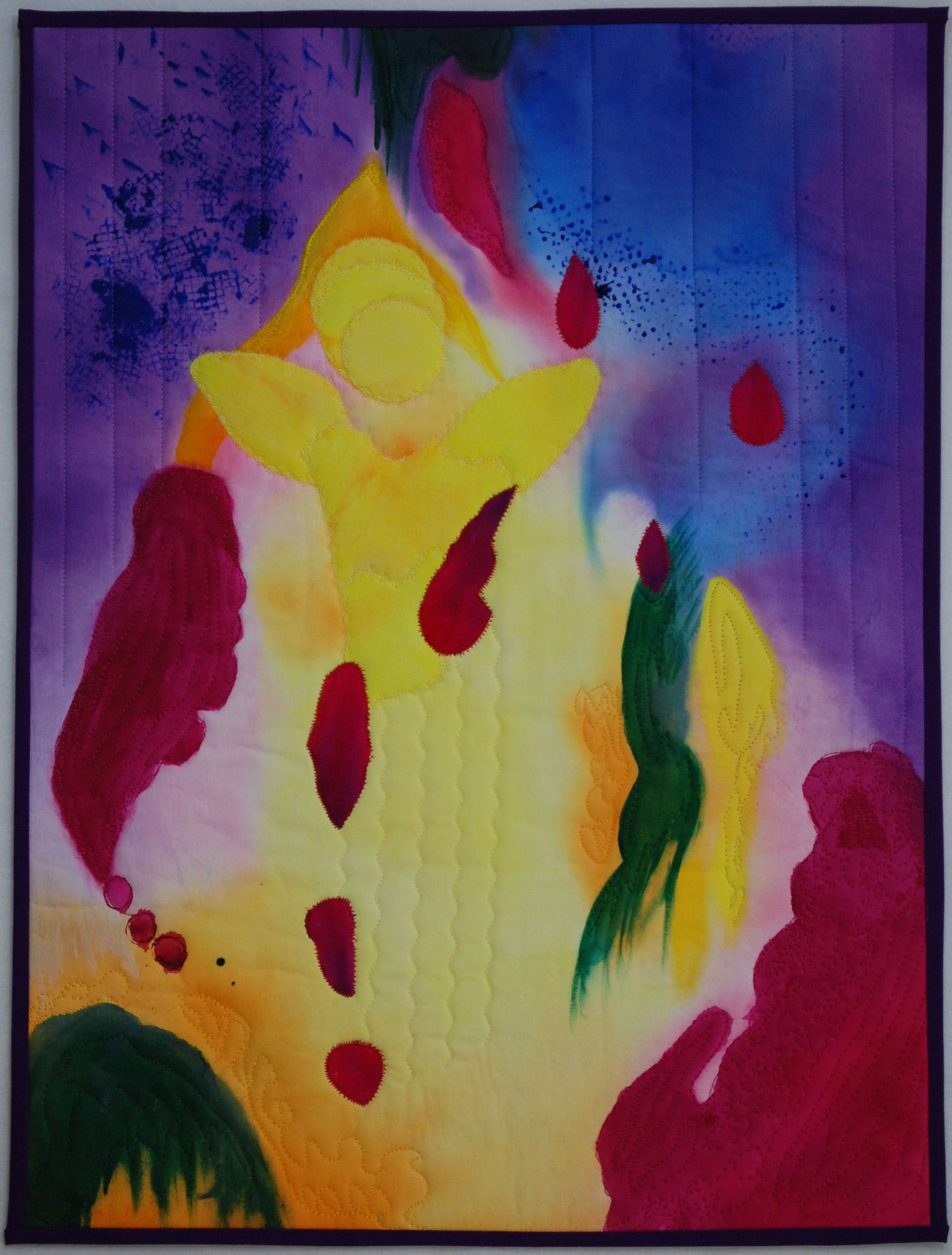 Original Design by me. Painted background with added applique fused and stitched. Some Free Motion Quilting. Some machine quilting. 18" wide by 24" long