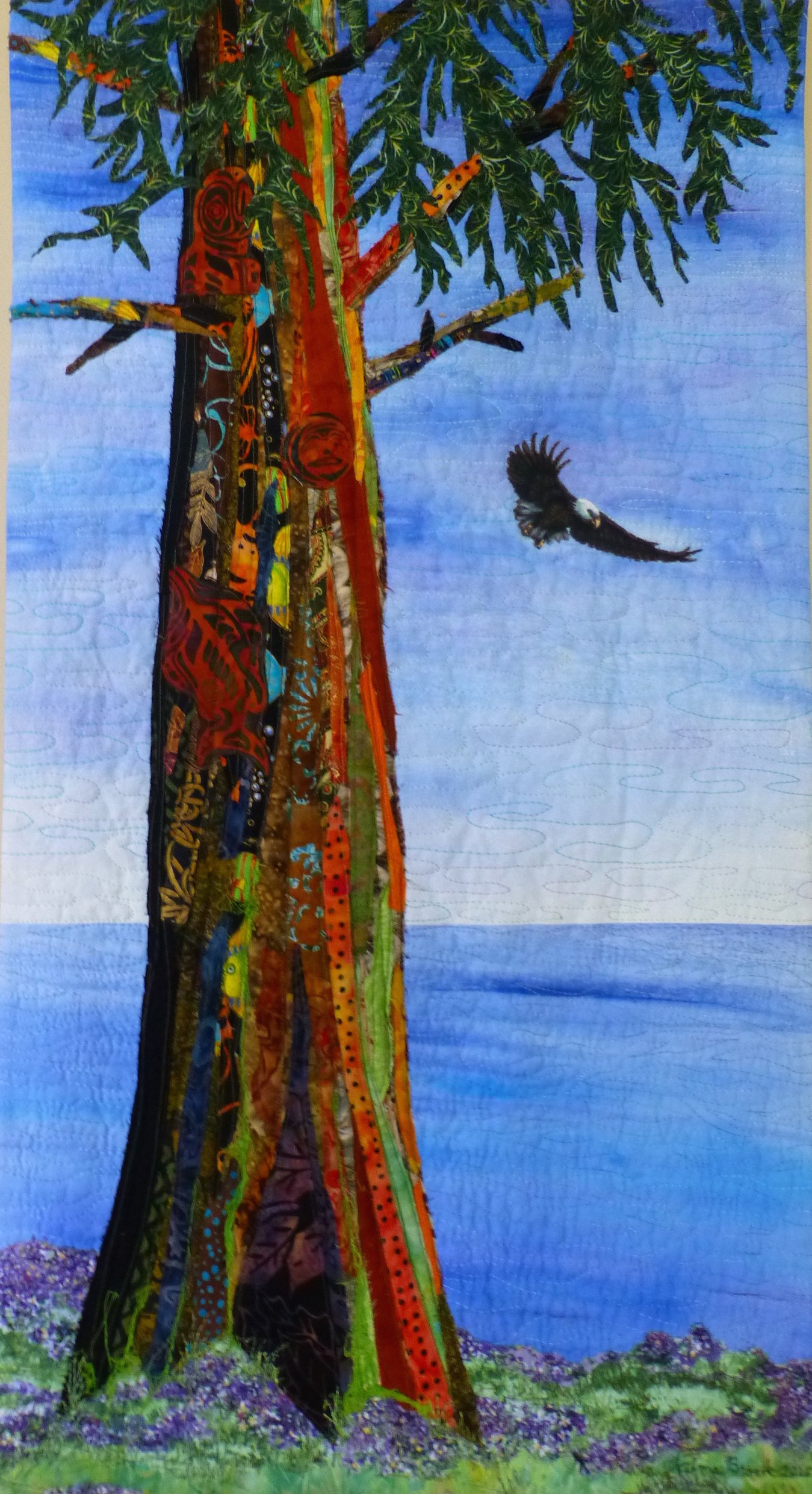 Two "majestic beauties" on the west coast of British Columbia are the cedar tree and the bald eagle. This winter we have seen hundreds of bald eagles in the trees nearby and they inspired me to make this wallhanging. The collage technique was learned in a class with Susan Teece. The background is hand painted with fabric paints.