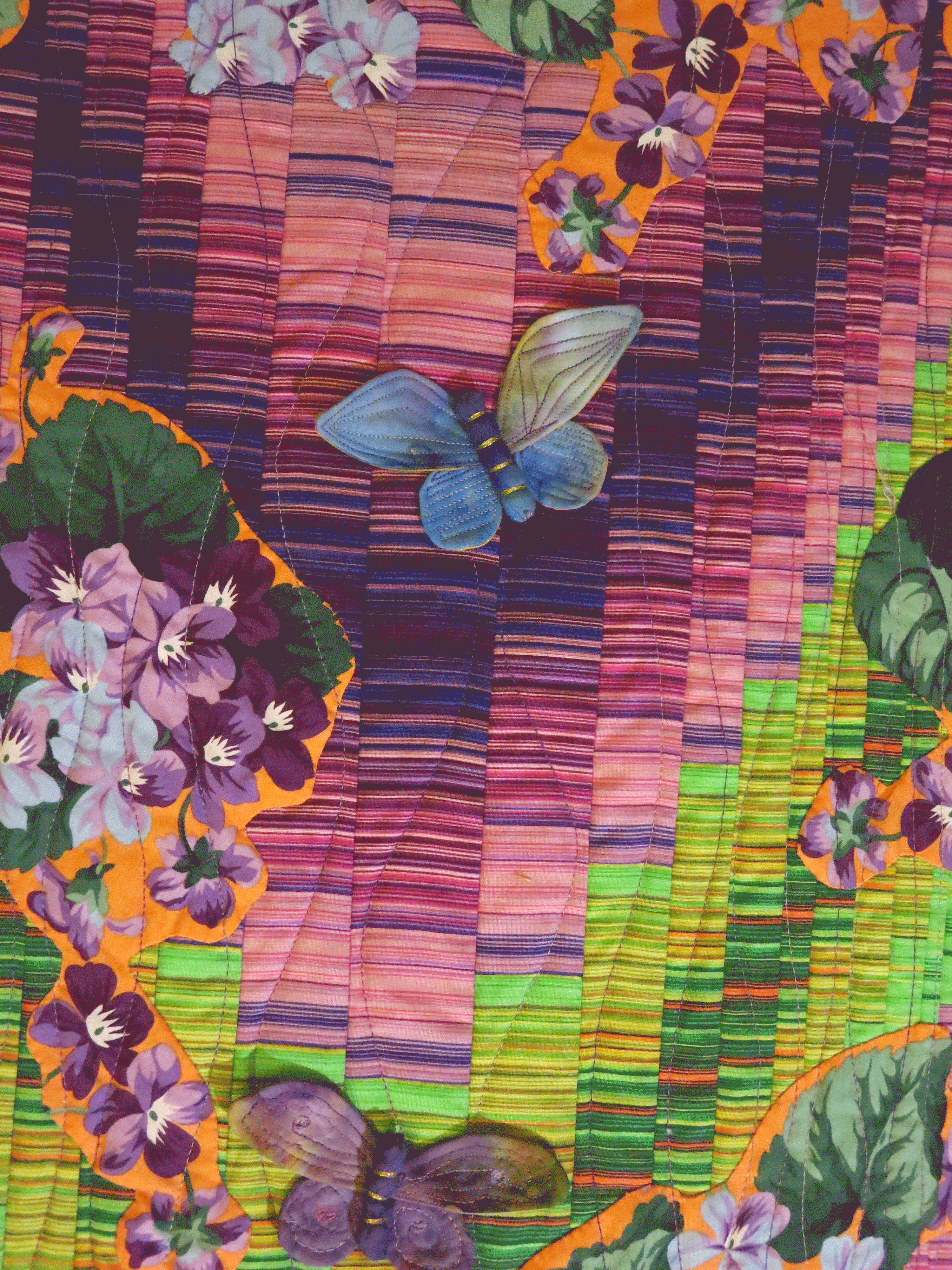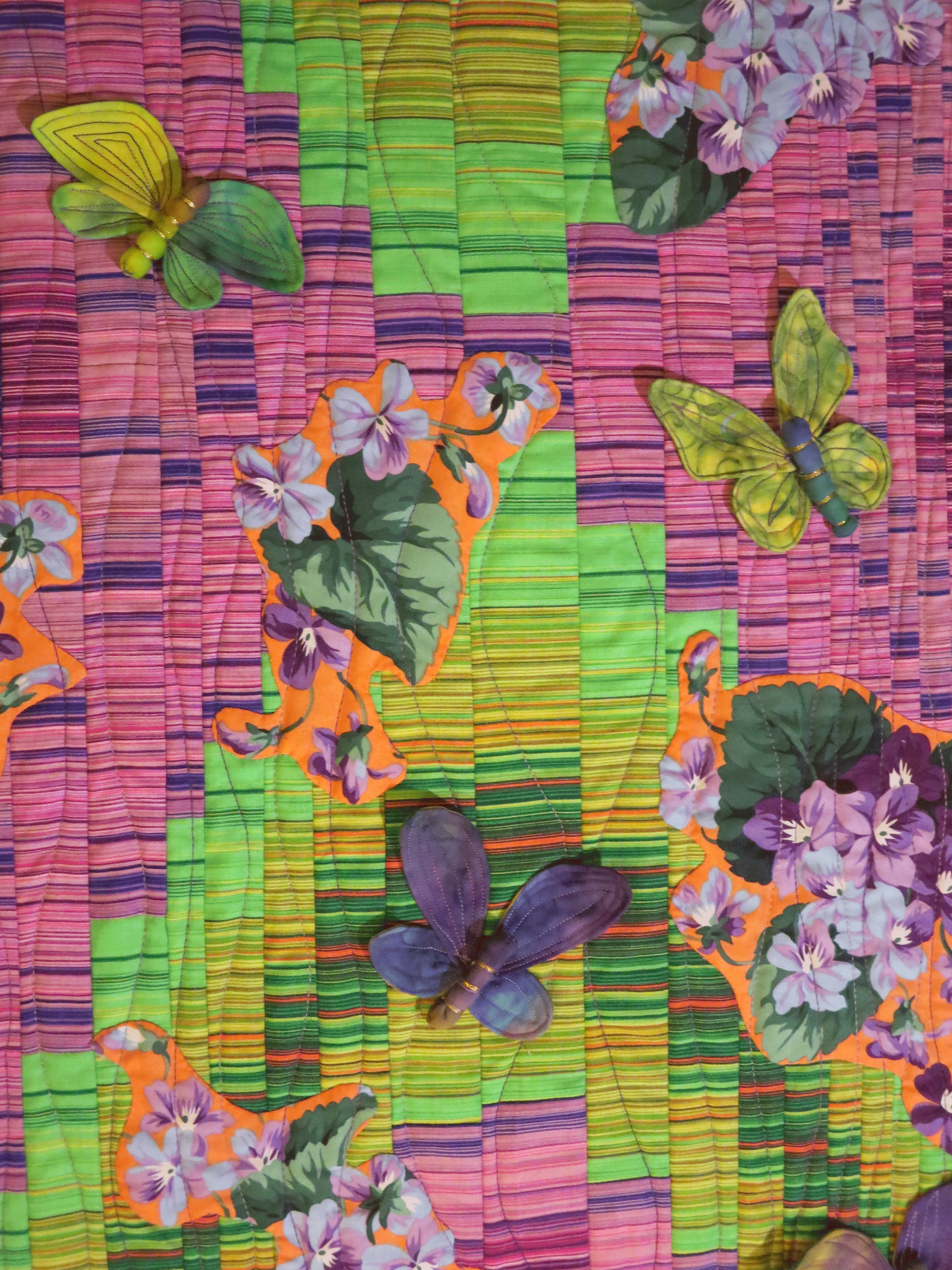 | Embellishments - Other Desc. | Butterflies constructed from fabric and batting attached to quilt using buttons on the back to secure them. |